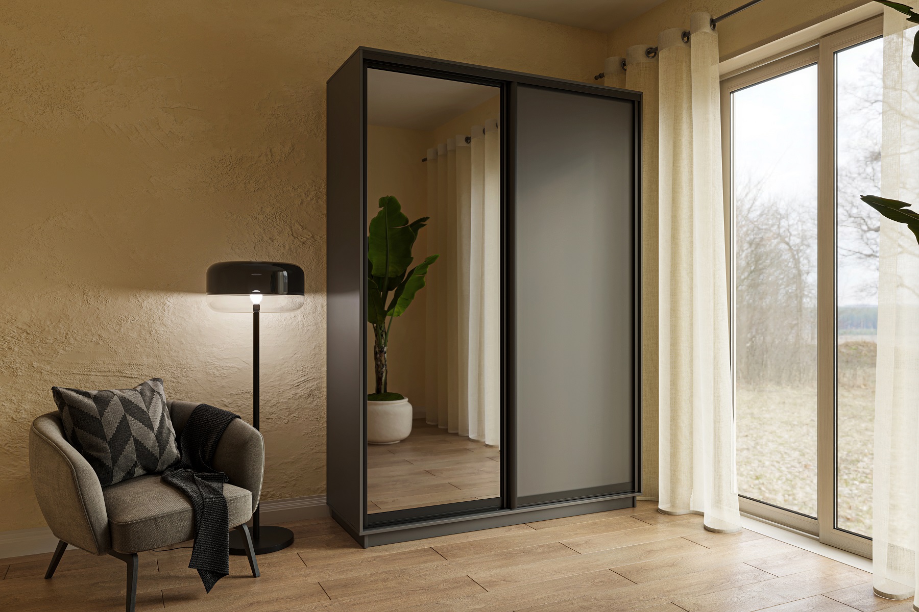 je dvoudveřová moderní šatní skříň, která je charakteristická praktickým úložným prostorem. Skříň disponuje posuvnými dveřmi. Je v barevném provedení grafit/černá.