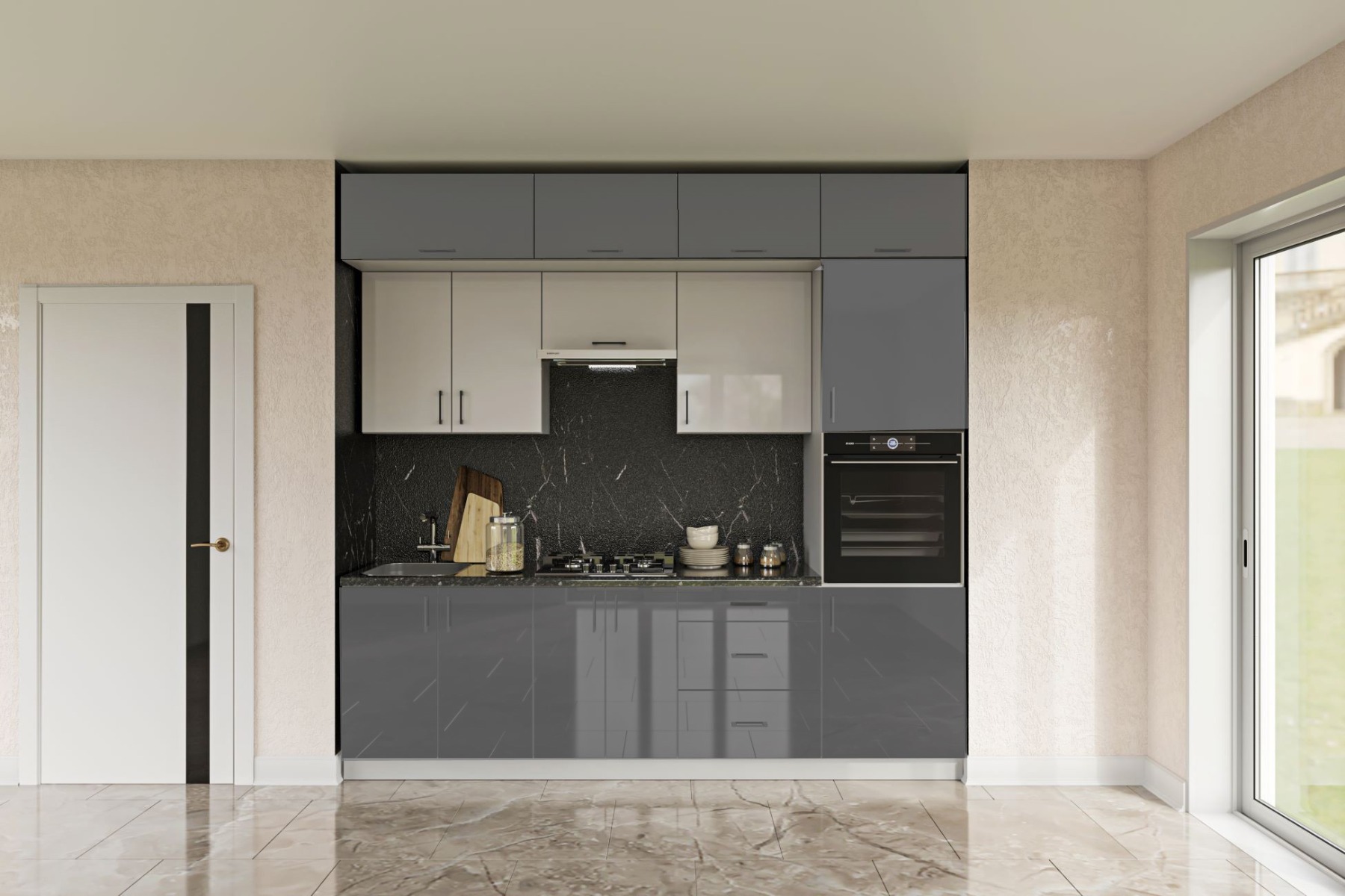 Kuchyňská linka má dvířka v barvě: antracitový lesk+ledově šedý lesk; korpus je v barvě: bílá matná.