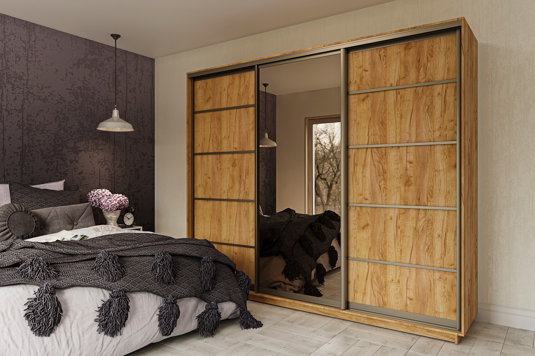 je třídveřová moderní šatní skříň, která je charakteristická praktickým úložným prostorem. Skříň disponuje posuvnými dveřmi. Je v barevném provedení dub Kraft.