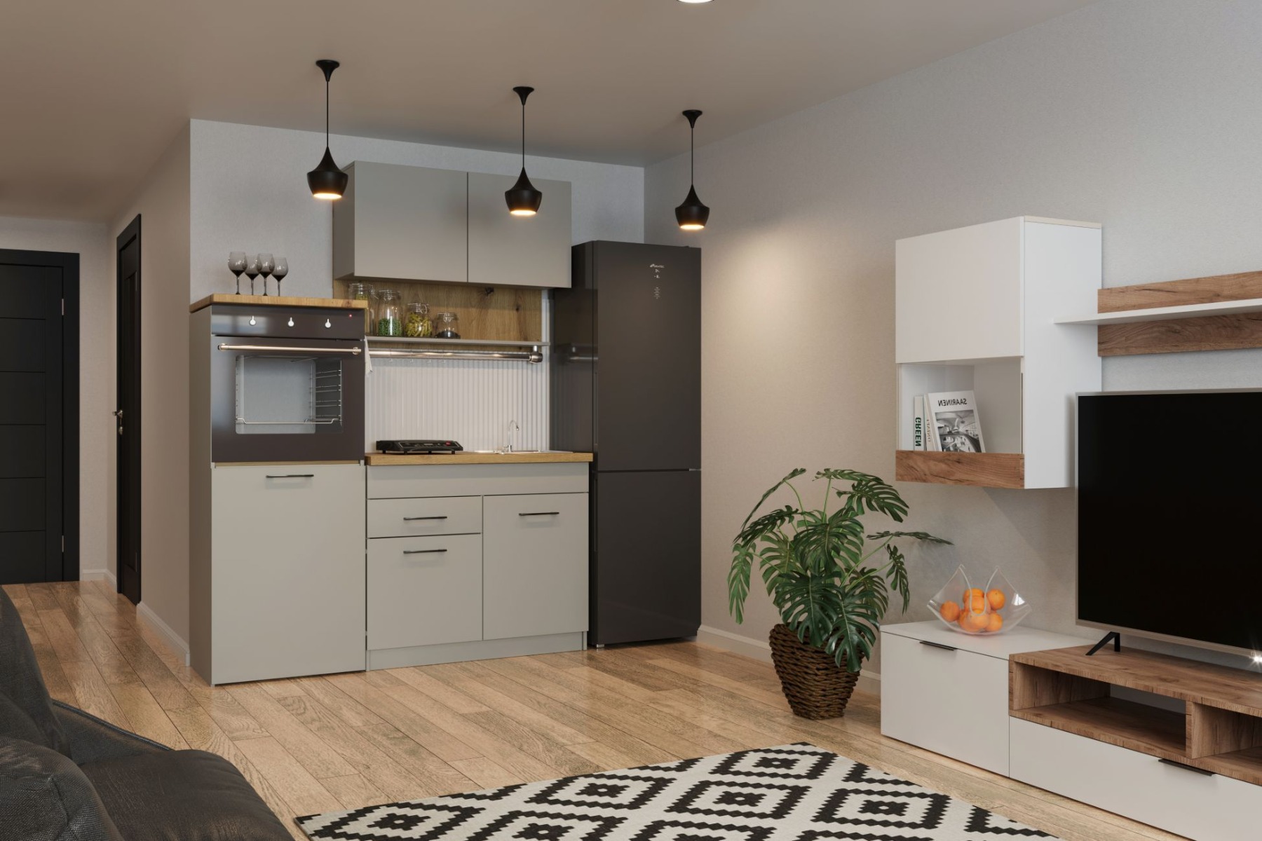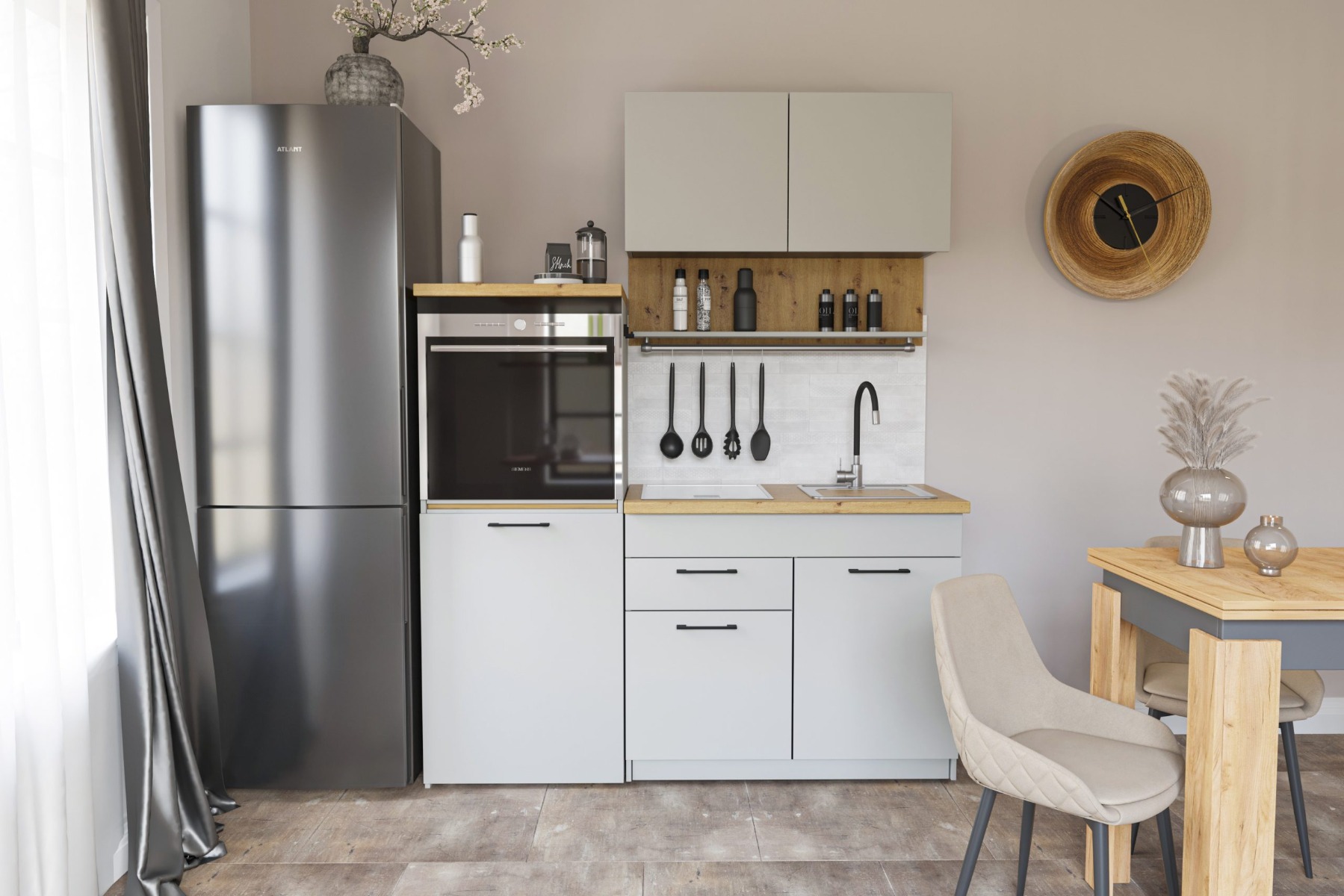 Kuchyňská linka 160 kombinuje moderní design s praktickým uspořádáním. Její závěsná skříňka s odkapávačem umožňuje efektivní sušení nádobí, zatímco skříňka s pracovní deskou poskytuje prostor pro přípravu jídla a uskladnění věcí. Multifunkční skříňka nabízí prostor pro mikrovlnku nebo troubu, což přidává další úroveň praktičnosti a pohodlí. Pro větší pohodlí a styl je součástí LED podsvícení.