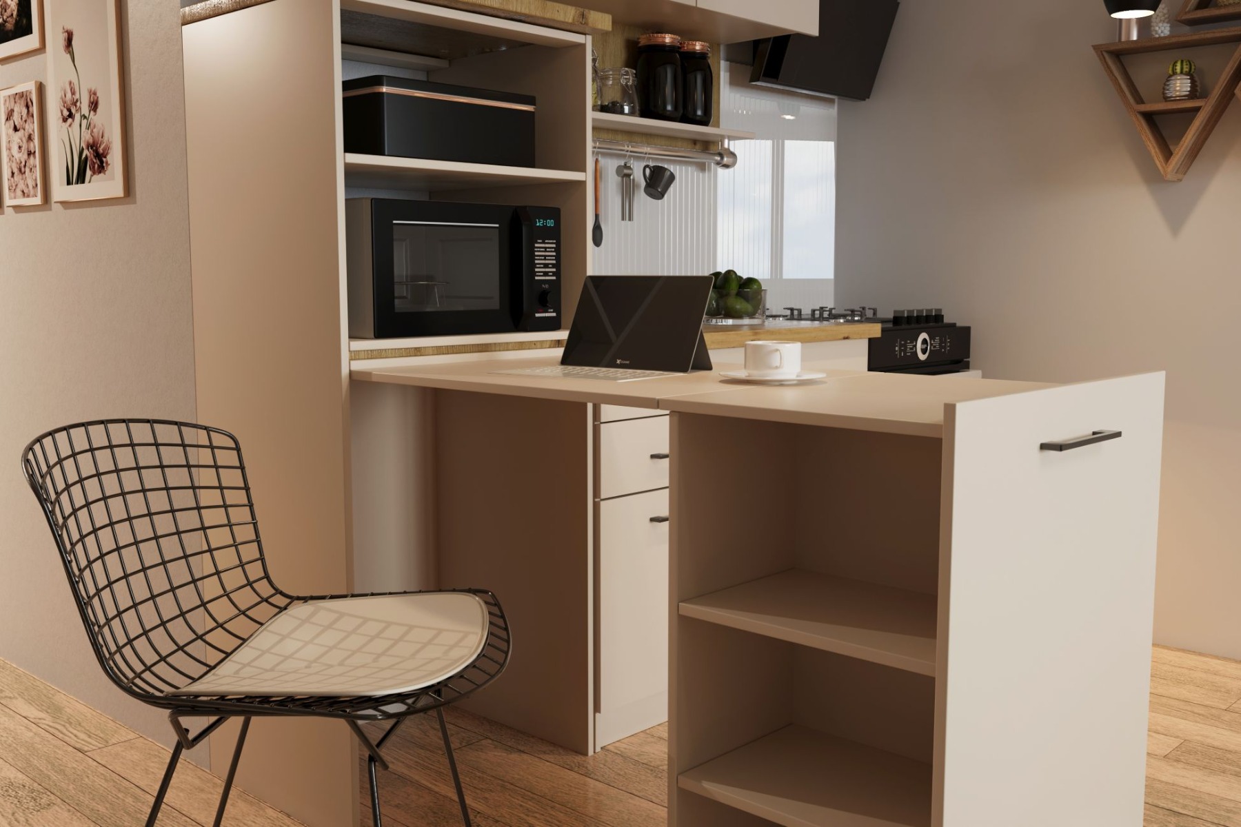 - Multifunkční skříňka s výsuvným stolem, kterou lze využít na mikrovlnku nebo troubu
