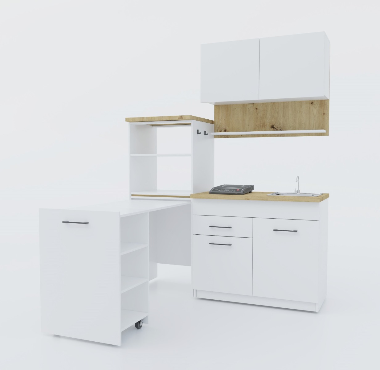 Mikrovlnka ani trouba nejsou součástí. Pracovní deska v barvě dub Artisan je v ceně.