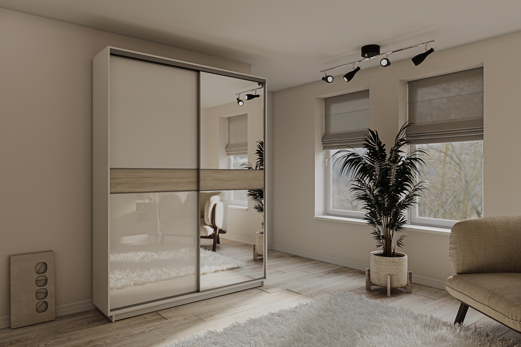 STEPHÁNÍ je dvoudveřová moderní šatní skříň, která je charakteristická praktickým úložným prostorem. Skříň disponuje posuvnými dveřmi. Je v barevném provedení bílá / dub Sonoma.