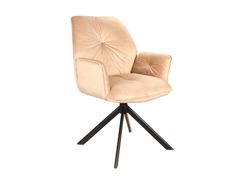 Křeslo je čalouněno kvalitní látkou v barevném odstínu béžová bluvel 28. Nohy židle jsou kovové, v černé barvě.