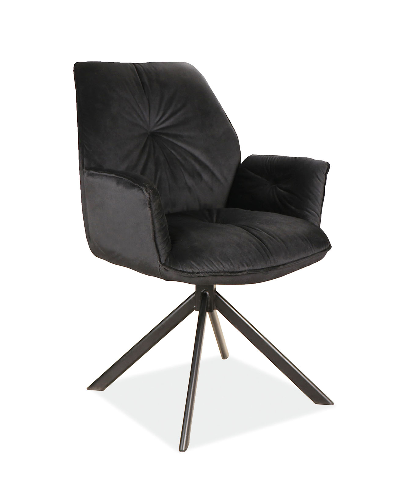 Křeslo je čalouněno kvalitní látkou Bluvel 19 - černá. Nohy židle jsou kovové, v černé barvě.