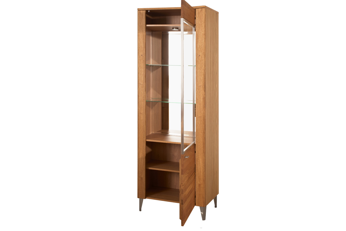 Korpus vitríny je vyroben z přírodní dýhy. Přední část je vyrobena z masivu dubového dřeva. Úchyty jsou pochromované, ve stříbrné barvě. Barevné provedení: dub medový. Disponuje vysokými elegantními nožičkami.