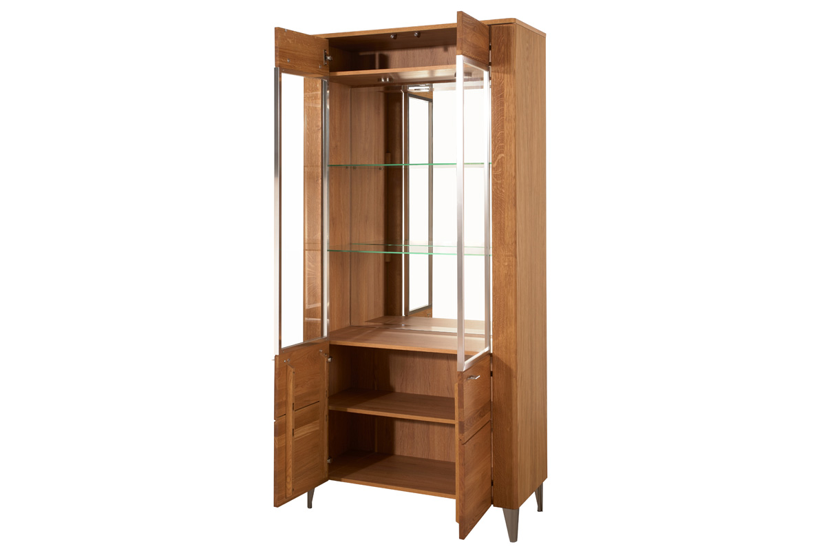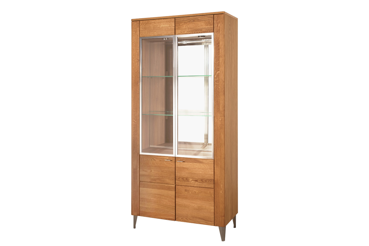 Korpus vitríny je vyroben z přírodní dýhy. Přední část je vyrobena z masivu dubového dřeva. Úchyty jsou pochromované, ve stříbrné barvě. Barevné provedení: dub medový. Disponuje vysokými elegantními nožičkami.