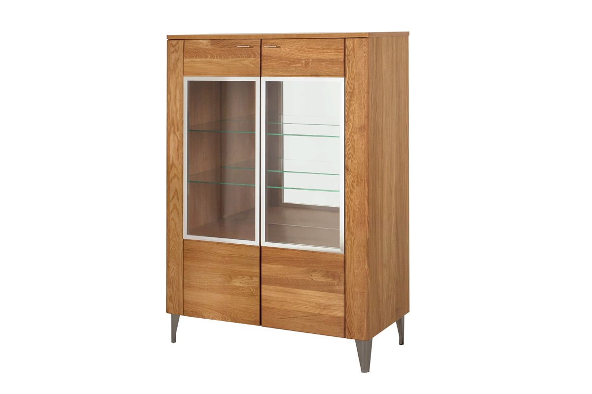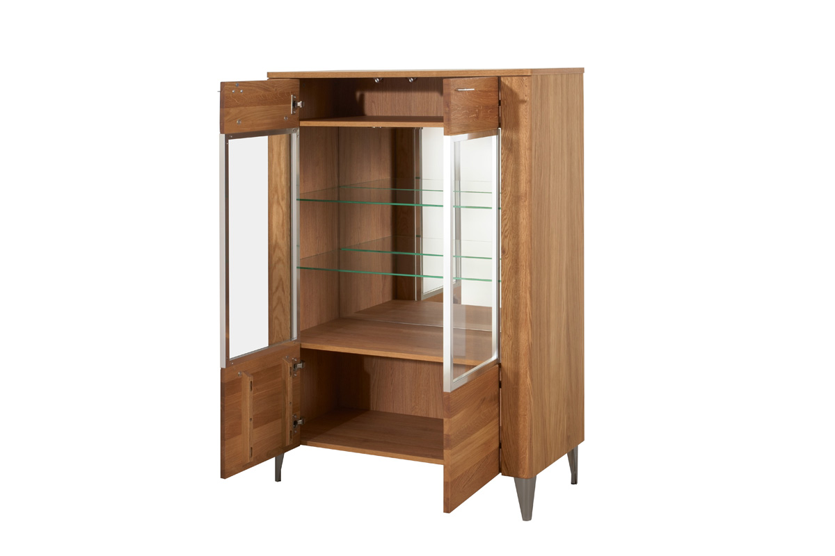 Korpus vitríny je vyroben z přírodní dýhy. Přední část je vyrobena z masivu dubového dřeva. Úchyty jsou pochromované, ve stříbrné barvě. Barevné provedení: dub medový. Disponuje vysokými elegantními nožičkami.