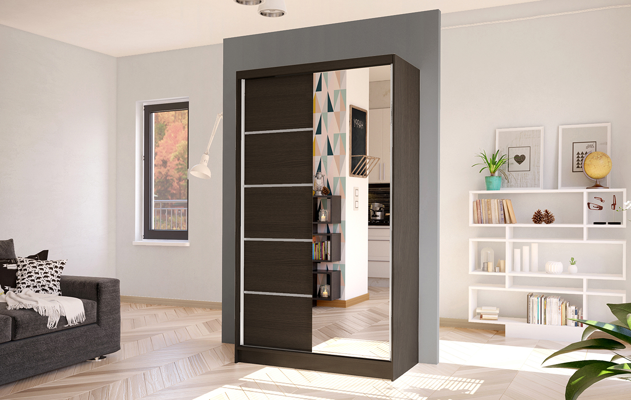 Šatní skříň Diem III v moderním designu má šířku 100 cm a je rozdělena na dvě praktické části. Posuvné dveře šetří místo a usnadňují přístup do interiéru. Vnitřní uspořádání kombinuje závěsnou tyč a čtyři police, což umožňuje přehledné a praktické rozdělení šatníku.