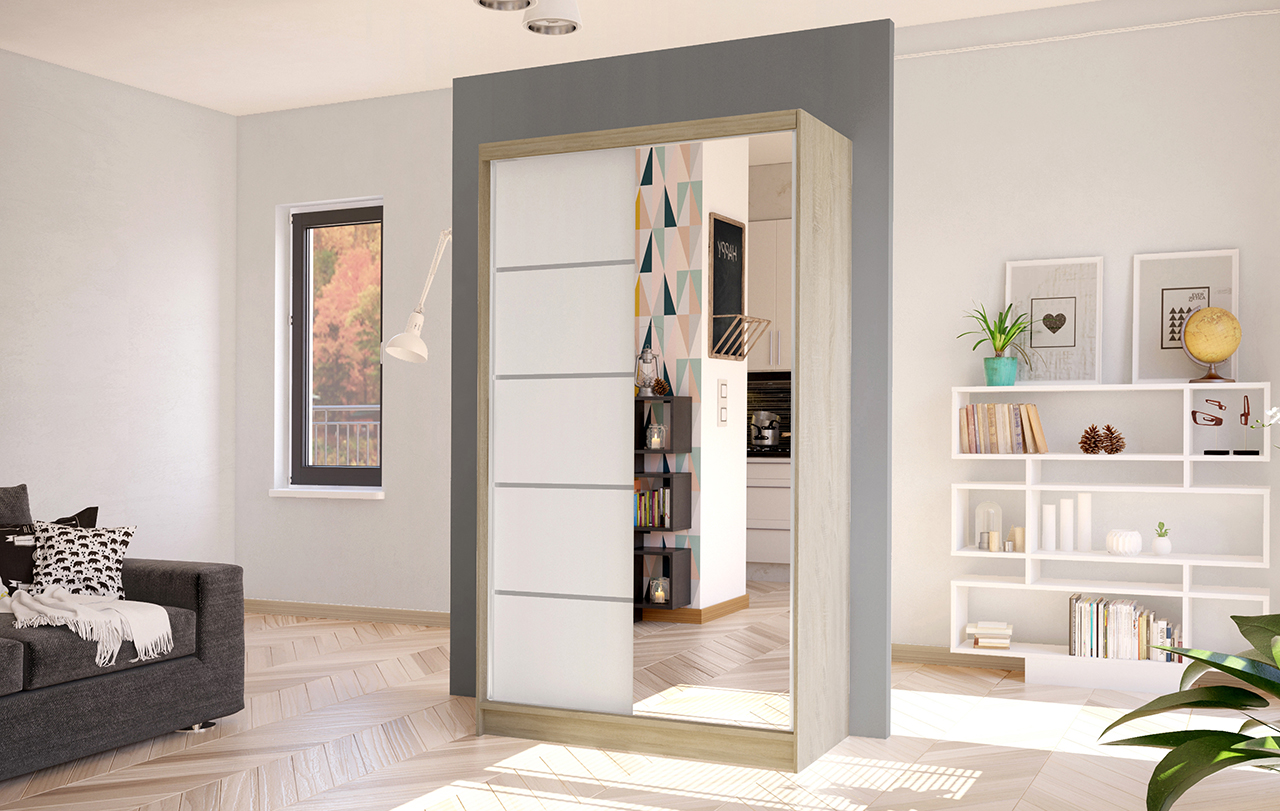 Šatní skříň Diem III v moderním designu má šířku 100 cm a je rozdělena na dvě praktické části. Posuvné dveře šetří místo a usnadňují přístup do interiéru. Vnitřní uspořádání kombinuje závěsnou tyč a čtyři police, což umožňuje přehledné a praktické rozdělení šatníku.
