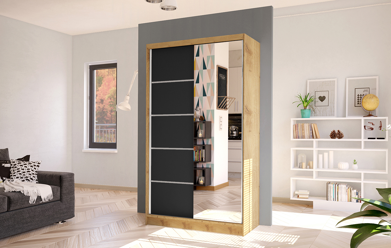 Šatní skříň Diem III v moderním designu má šířku 100 cm a je rozdělena na dvě praktické části. Posuvné dveře šetří místo a usnadňují přístup do interiéru. Vnitřní uspořádání kombinuje závěsnou tyč a čtyři police, což umožňuje přehledné a praktické rozdělení šatníku.