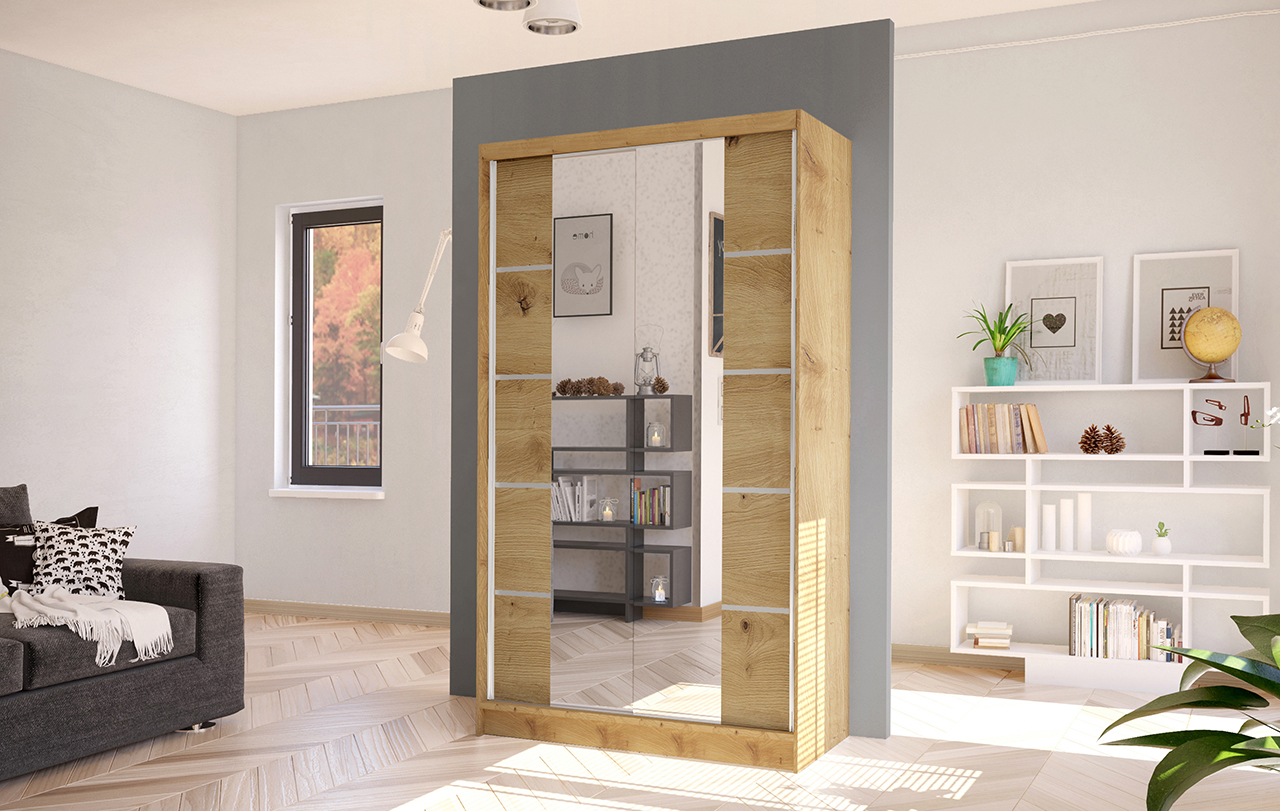 Šatní skříň Diem V v moderním designu má šířku 100 cm a je rozdělena na dvě praktické části. Posuvné dveře šetří místo a usnadňují přístup do interiéru. Vnitřní uspořádání kombinuje závěsnou tyč a čtyři police, což umožňuje přehledné a praktické rozdělení šatníku.