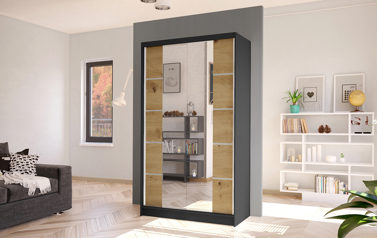 Šatní skříň Diem V v moderním designu má šířku 100 cm a je rozdělena na dvě praktické části. Posuvné dveře šetří místo a usnadňují přístup do interiéru. Vnitřní uspořádání kombinuje závěsnou tyč a čtyři police, což umožňuje přehledné a praktické rozdělení šatníku.