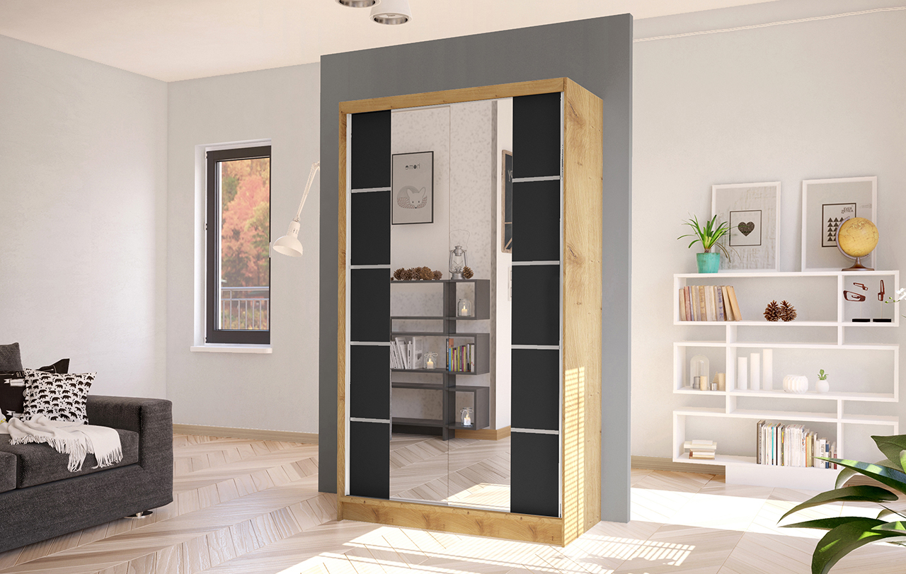 Šatní skříň Diem V v moderním designu má šířku 100 cm a je rozdělena na dvě praktické části. Posuvné dveře šetří místo a usnadňují přístup do interiéru. Vnitřní uspořádání kombinuje závěsnou tyč a čtyři police, což umožňuje přehledné a praktické rozdělení šatníku.