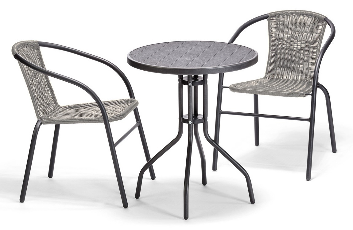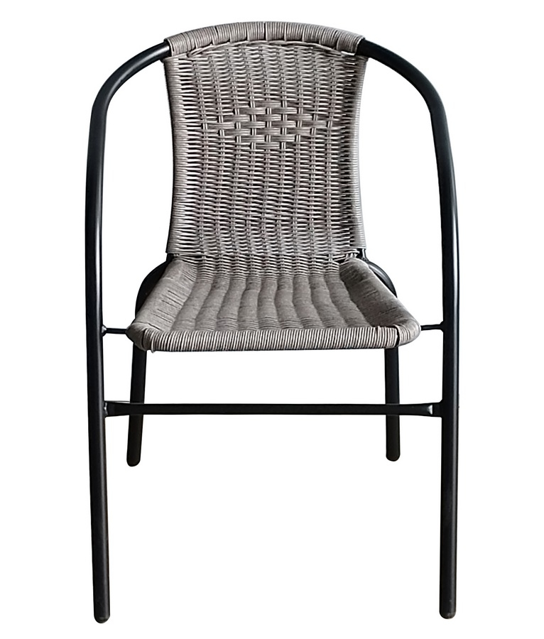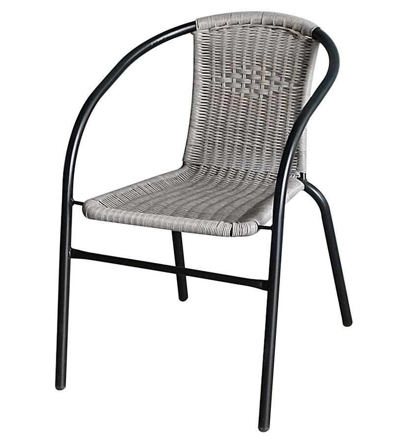 Balkonová židle. Díky volbě materiálu je lehce omyvatelná a její údržba není nijak náročná. Křeslo je z ocelové konstrukce černé barvy, sedák je z umělého ratanu šedé barvy. Výška sedu křesla je 42 cm, hloubka sedu je 39 cm.