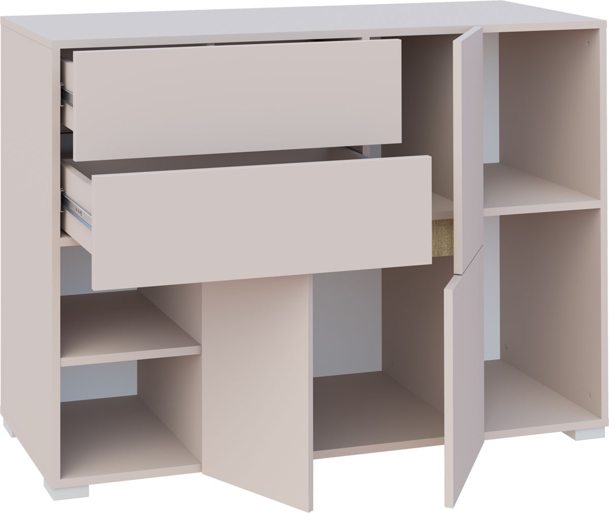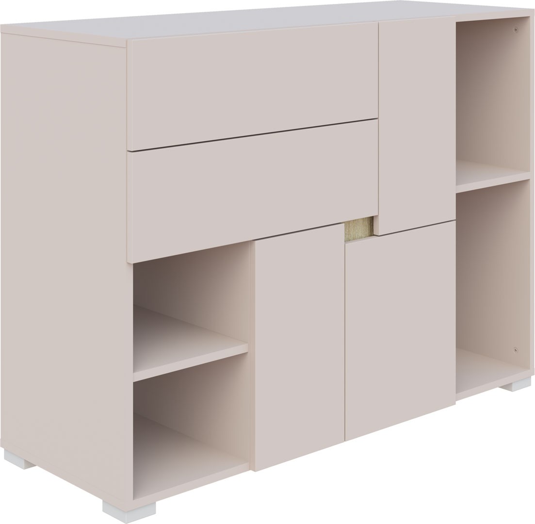 Praktická široká komoda je ideálním doplňkem do dětského nebo studentského pokoje. Komoda obsahuje praktické otevřené police, troje dvířka a 2 zásuvky. Uvnitř se nachází 1 police, která poskytuje dostatek prostoru pro oblečení, hračky či školní potřeby. Komoda je vyrobena z kvalitní LTD desky o tloušťce 16 mm a zaujme moderním provedením kašmír s detaily v dekoru dub Sonoma.