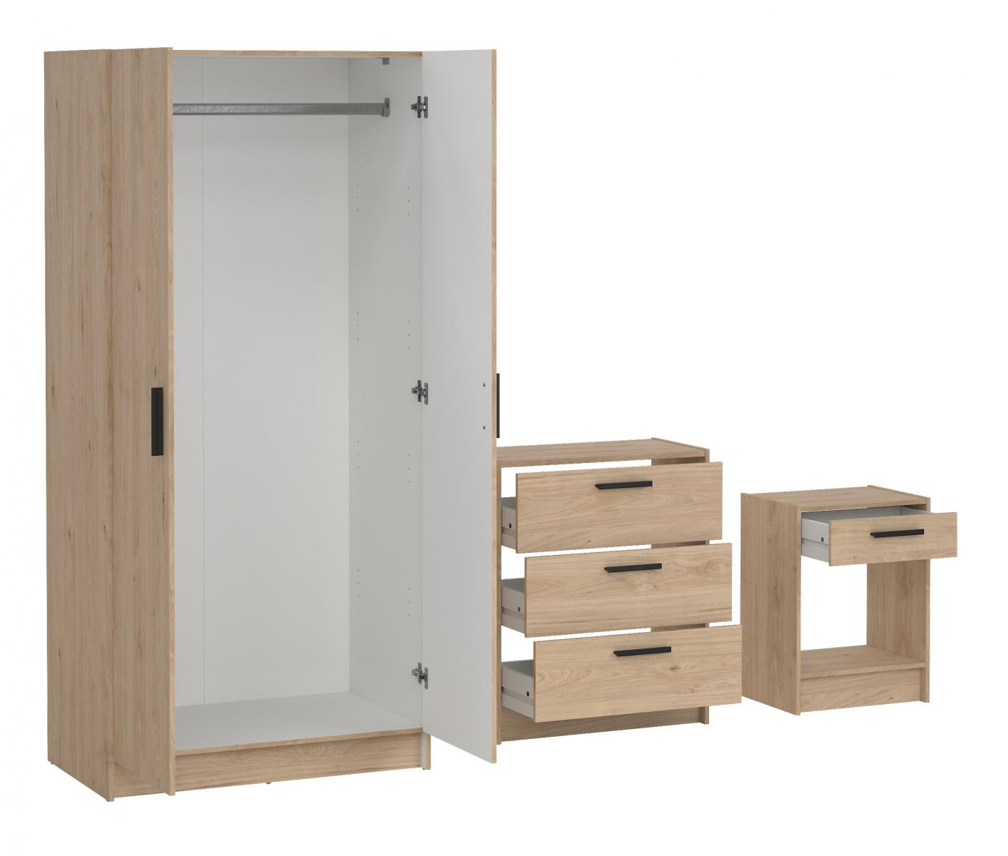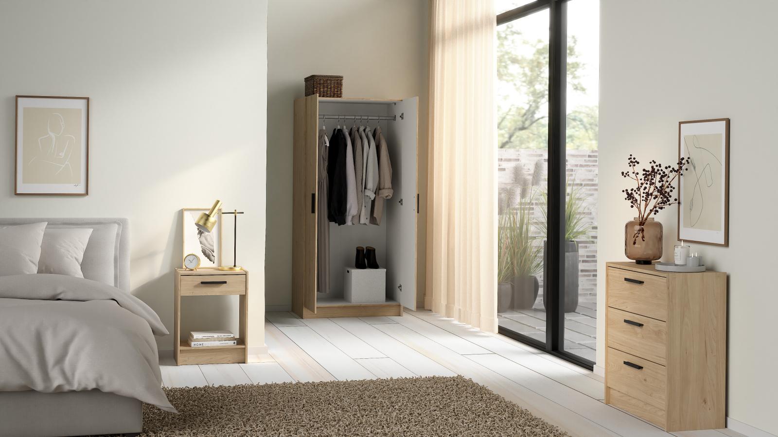 Nábytková sestava Start dánského výrobce nabízí moderní, čistý design, který snadno zapadne do jakéhokoli interiéru. Tvoří ji prostorná šatní skříň, elegantní komoda a stylový noční stolek, které společně vytvářejí harmonický a funkční celek. Kvalitní zpracování a nadčasový vzhled dělají z této sestavy skvělou volbu pro váše útulné bydlení.