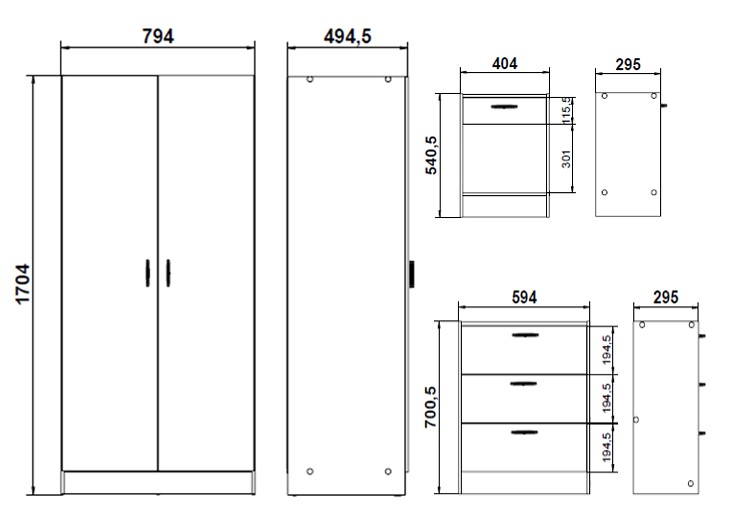 | Výška: | skříň 170,4 cm/ komoda 70 cm/ stolek 64 cm |