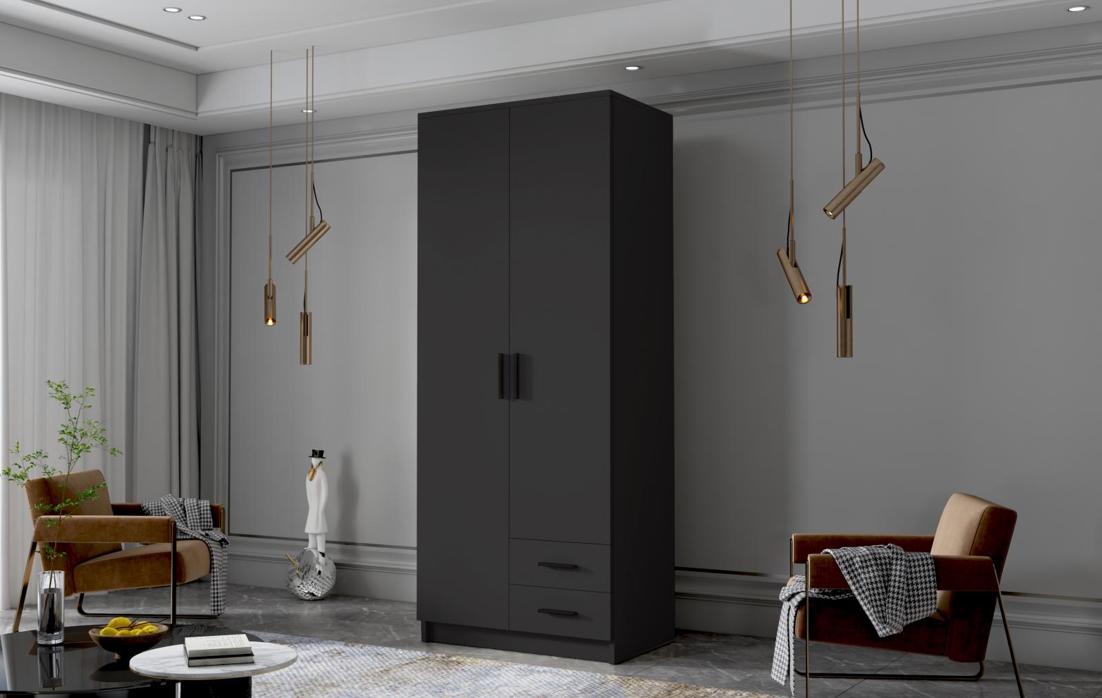 Šatní skříň Arya I v moderním designu má šířku 80 cm a je rozdělena na dvě praktické části. Vnitřní uspořádání kombinuje závěsnou tyč, čtyři police a 2 šuplíky, což umožňuje přehledné a praktické rozdělení šatníku.