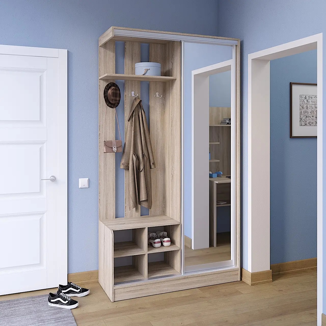 Součástí sestavy je šatní skříň s posuvnými dveřmi, které jsou doplněny o zrcadlo, díky čemuž předsíň působí světleji a opticky větší. Praktické věšáky a botník zajišťují přehledné uspořádání a komfort při každodenním používání.