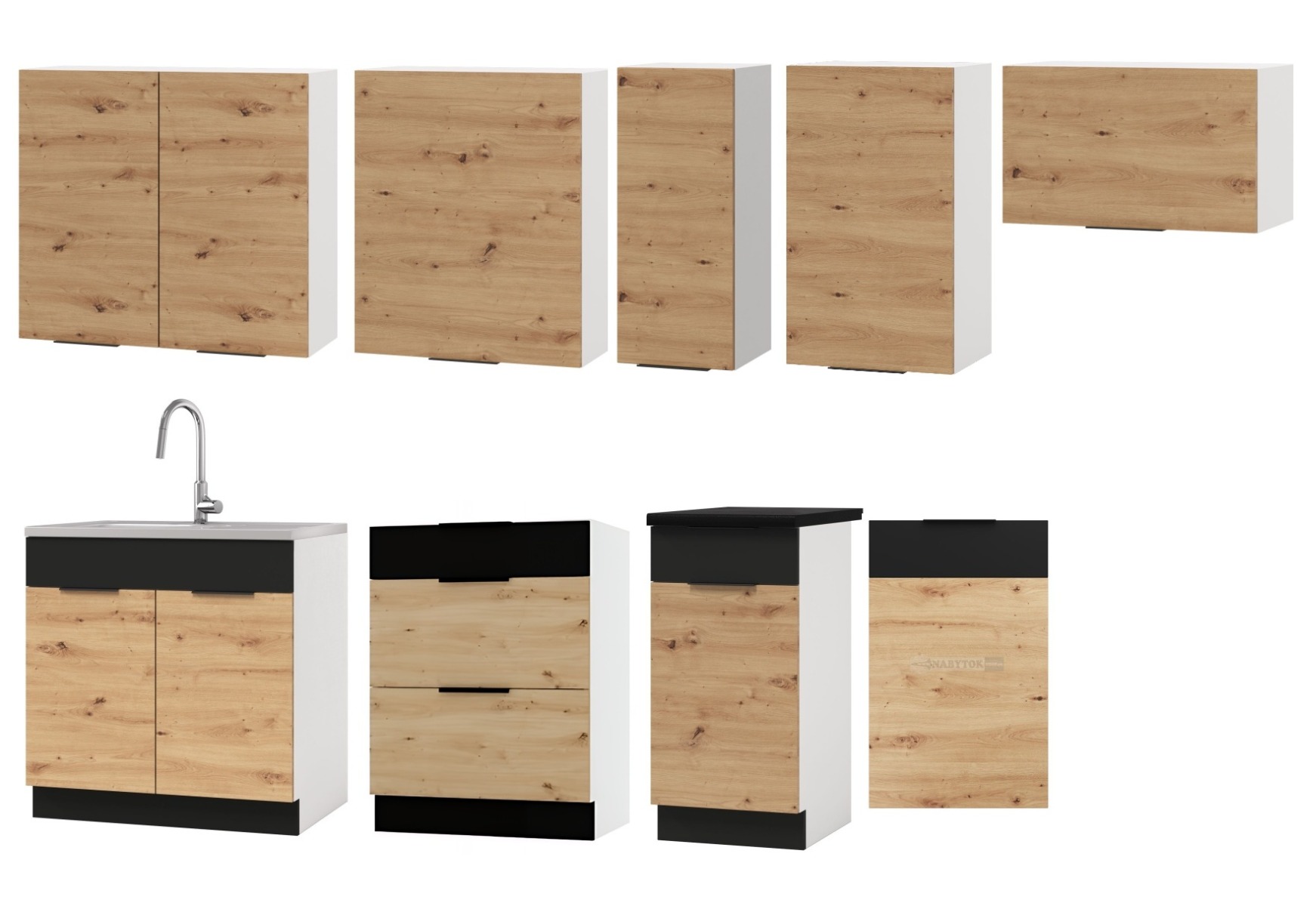 Korpus je bílý, dvířka jsou v barvě dub artisan doplněné černou barvou.