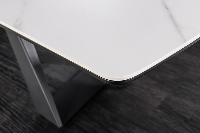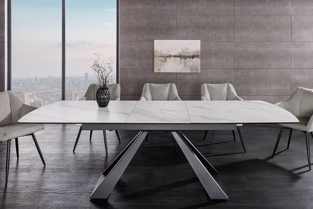 Stůl má rozměry 180-230 cm na šířku, 77 cm na výšku a 90 cm hloubku, poskytuje tedy dostatek prostoru pro obědy, občerstvení nebo posezení se skleničkou vína či čajem. Keramická deska je zpracována tak, aby vynikla krása dekoru mramoru, který má na povrchu. Deska jídelního stolu je spojena s bezpečnostním tvrzeným sklem, které je velmi pevné a odolné proti úderům a nárazům. Značným násilím se dá ale rozbít vše, pokud tedy dojde k rozbití, tak o toto sklo se nelze pořezat, protože nevznikají ostré střepy, ale takzvané neostré plošky, o které se nelze poranit. Kovové práškově lakované nohy zajišťují stabilitu a odolnost.
