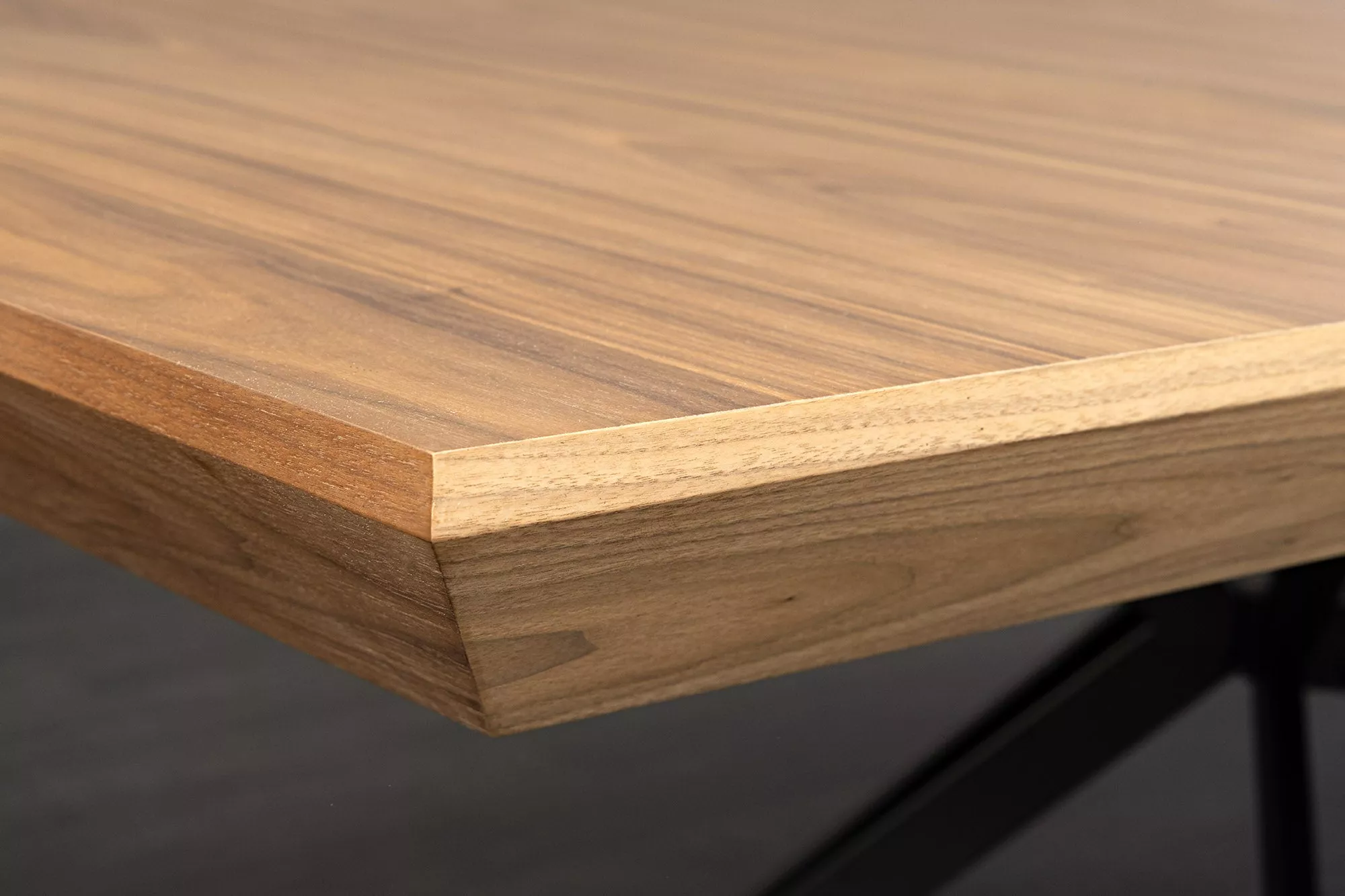 Rozkládací jídelní stůl GIANT 200-320 cm. Tento impozantní stůl nabízí díky třem deskám možnost prodloužení z 200 na 320 cm – ideální pro slavnostní večeře i běžné domácí užívání. Deska z ořechové dýhy v přírodní barvě vypadá autenticky, zatímco černě práškovaný kovový rám dodává industriální charakter a pevnost. Výškově nastavitelné podložky zajišťují stabilitu i na mírně nerovném podkladu. Prostorný stůl, který zaujme i v prostorných jídelnách i loftových prostorách.