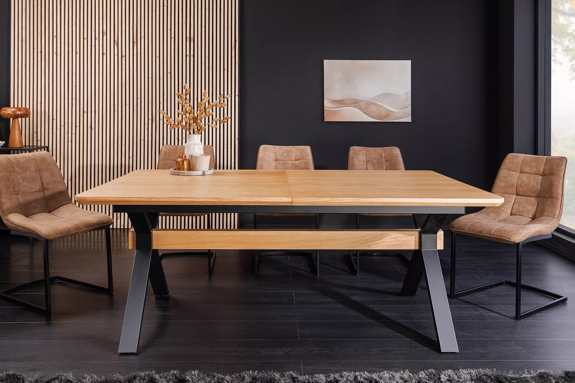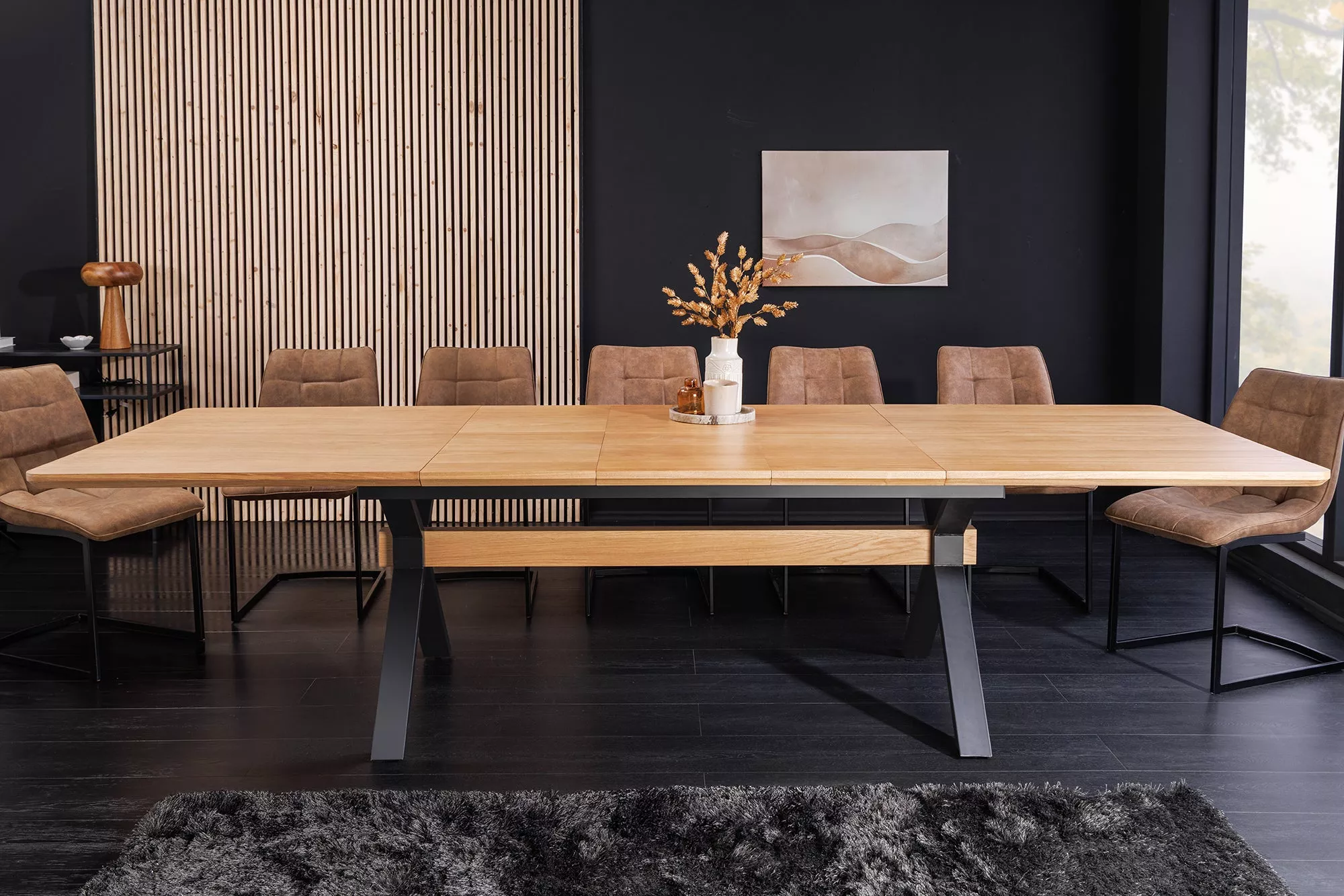 Rozkládací jídelní stůl GIANT NATUR II 180-300 cm. Tento stůl nabízí flexibilní délku od 180 až po 300 cm díky třem výsuvným deskám, což umožňuje pohodlné usazení až 12 osob. Deska je potažená dubovou dýhou v přírodním odstínu, zatímco robustní X-rám z černého práškovaného kovu se středovým dekorativním hranolem dodává konstrukci pevný, moderní a industriální vzhled. Výškově nastavitelné podlahové body zaručují stabilitu i na nerovném podkladu. Praktický, pevný a designově výrazný kousek pro vaše společné chvíle.
