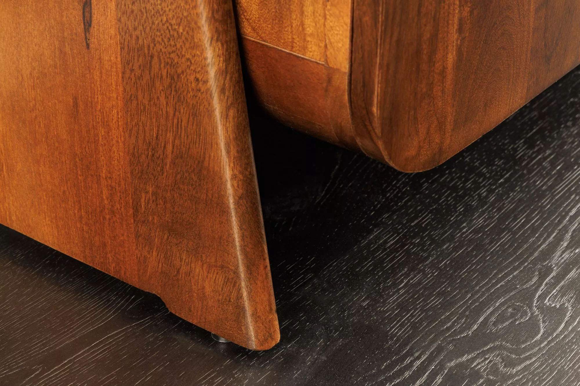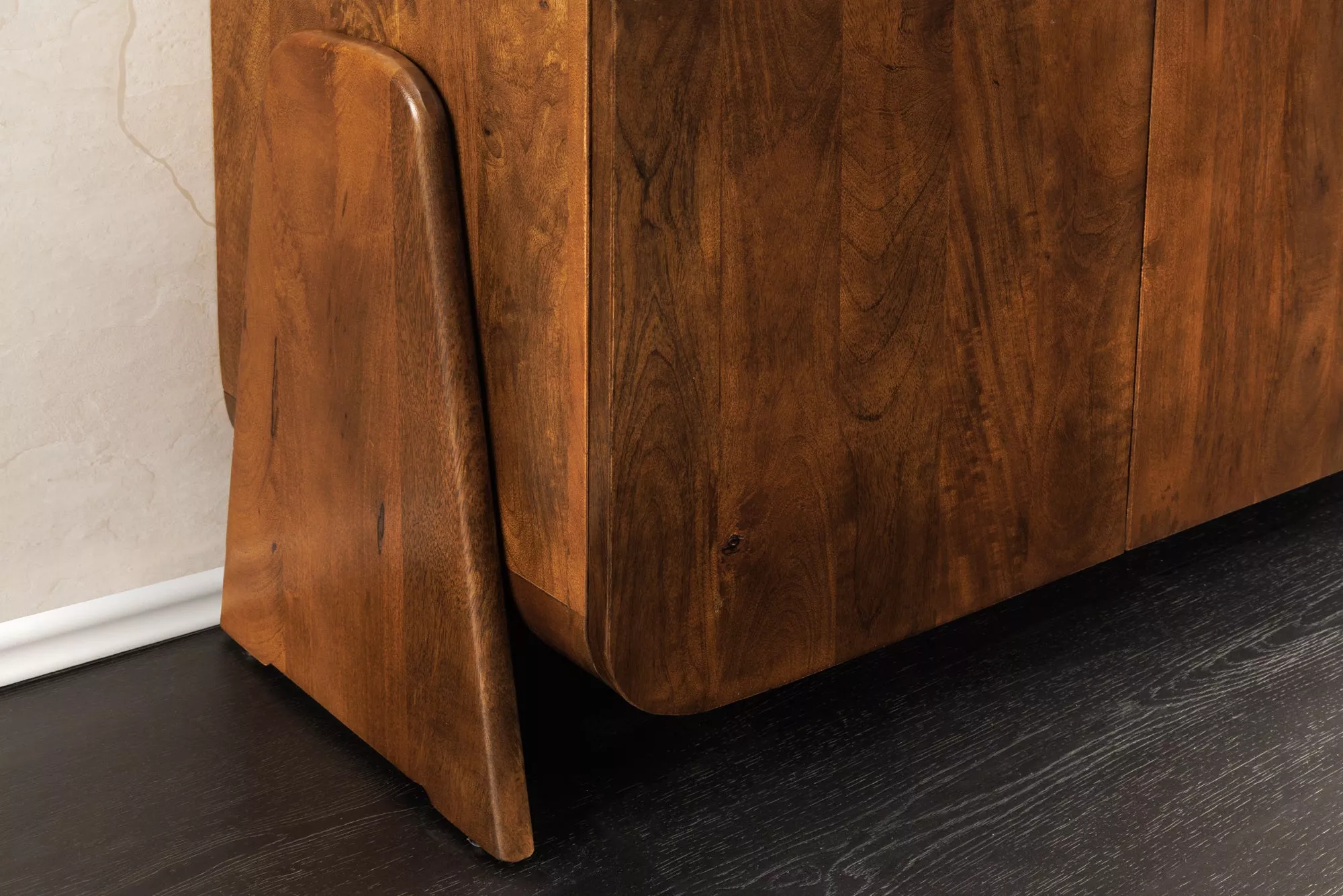 Komoda BRASIL zaujme svou hnědou barvou a charakteristickou strukturou mangového dřeva v kombinaci s elegantním, bezúchytkovým designem dvířek. Díky čtyřem skrytým přihrádkám za dveřmi poskytuje bohatý úložný prostor pro knihy, dekorace, nádobí či osobní věci. Lehkost a vzdušnost dodávají boční, decentně umístěné nožky, zatímco podložky chrání podlahu a zajišťují stabilitu.