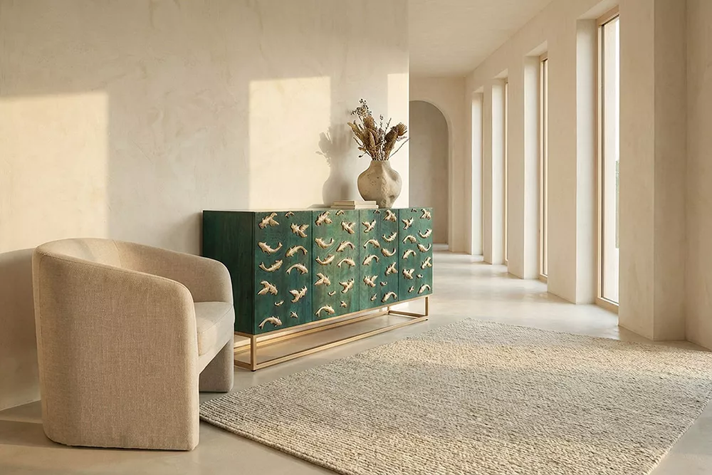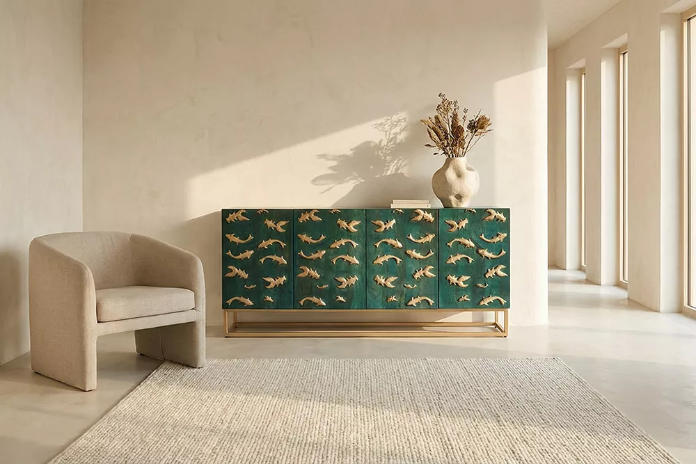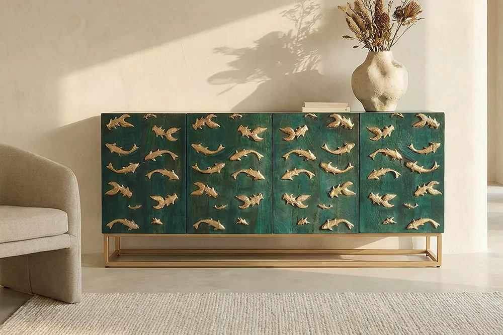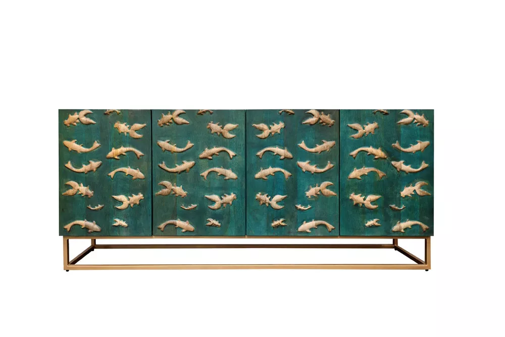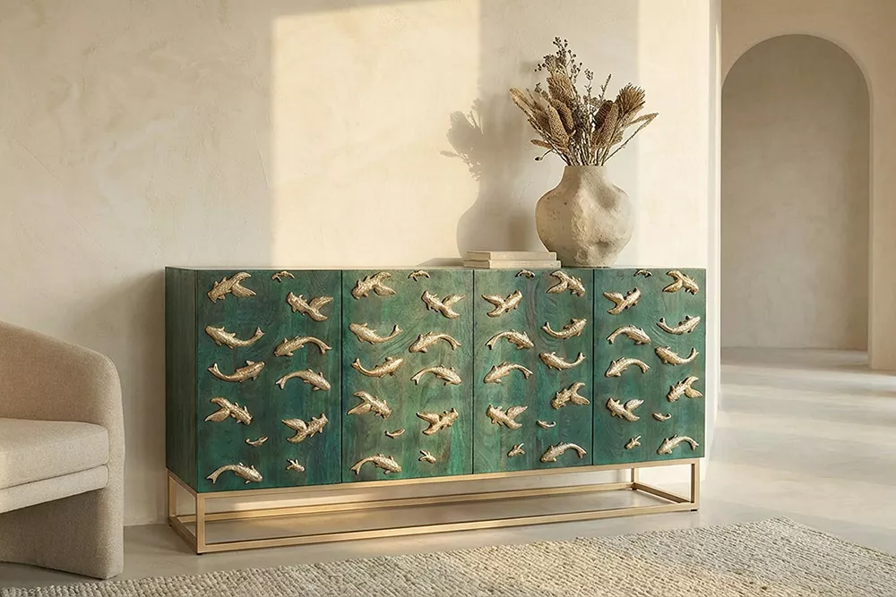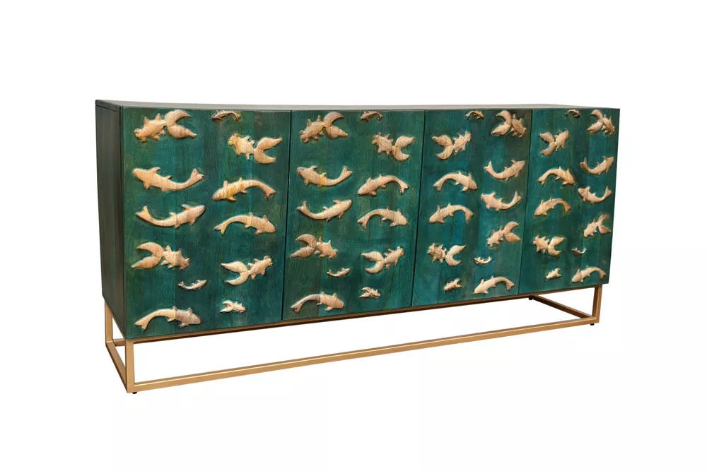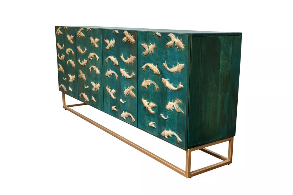 Masivní komoda GOLDEN LAGOON z mangového dřeva v tyrkysovo-zlatém provedení je výrazný designový kousek, který okamžitě upoutá pozornost. Reliéfní 3D přední strana s detailním zpracováním dodávají nábytku hloubku a umělecký charakter, zatímco robustní konstrukce nabízí dostatek úložného prostoru pro každodenní potřeby. Ideální volba do moderních interiérů, které chtějí spojit funkčnost s luxusním a originálním designem.