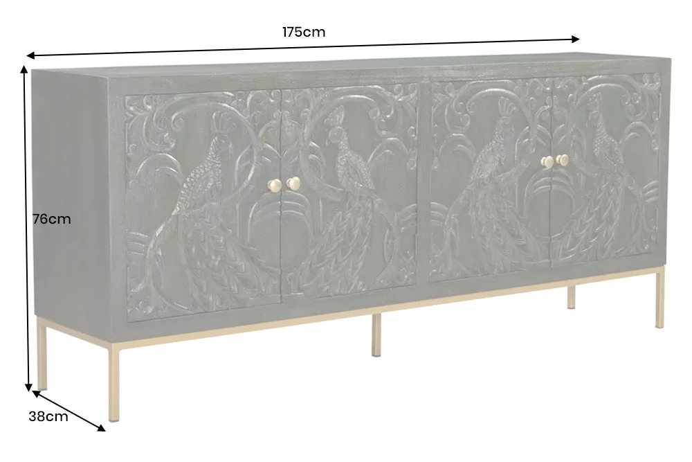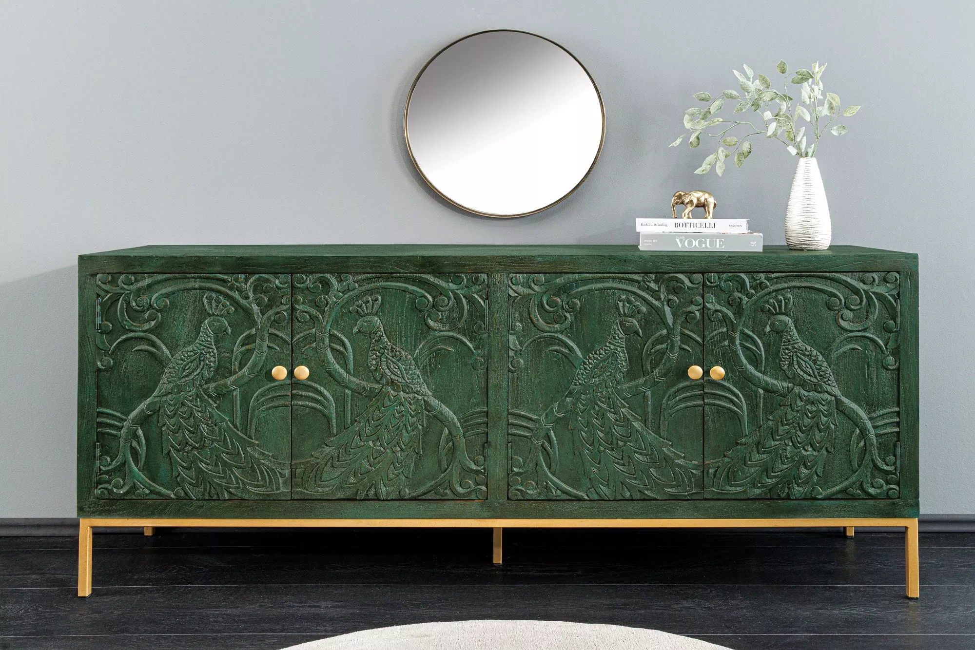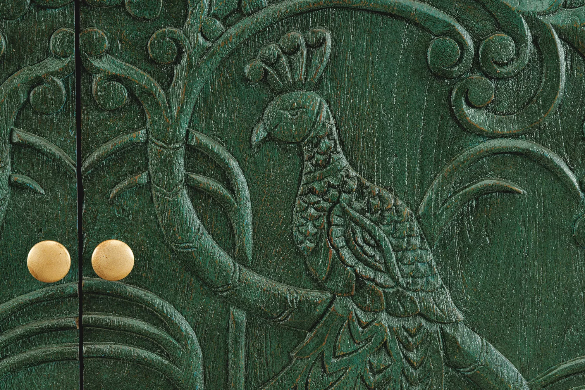 Komoda PEACOCK okamžitě upoutá svým exotickým designem. Každé dveře komody zdobí propracovaná 3D řezba s motivem páva, která vyniká na zeleně lakovaném masivním mangovém dřevu. Praktické úložné prostory se ukrývají za dvířky a snadno pojmou vše potřebné. Díky ručnímu zpracování je každý kus originál. Hodí se jako stylový doplněk do interiéru laděného v duchu urban jungle i do moderního prostoru.