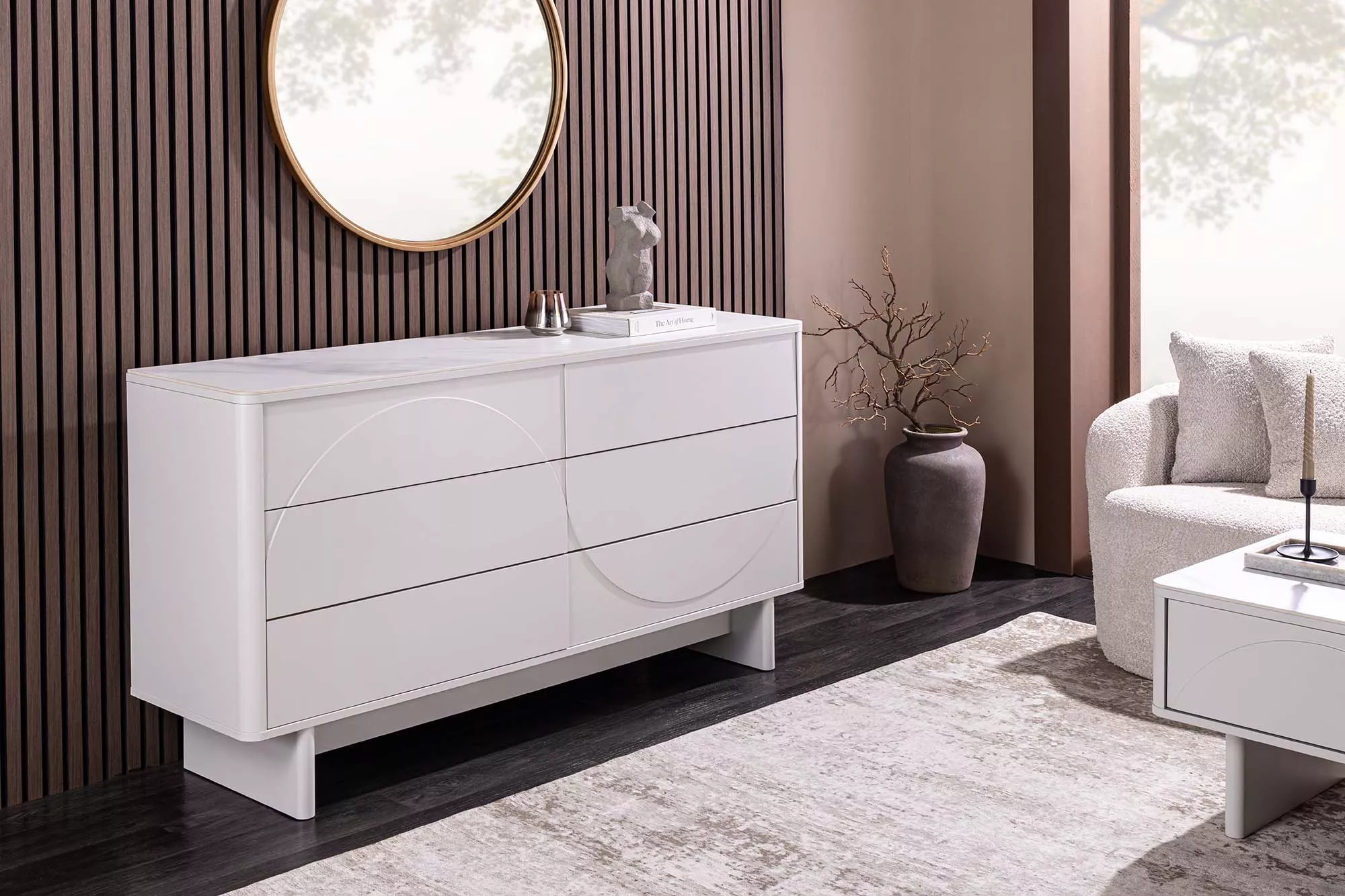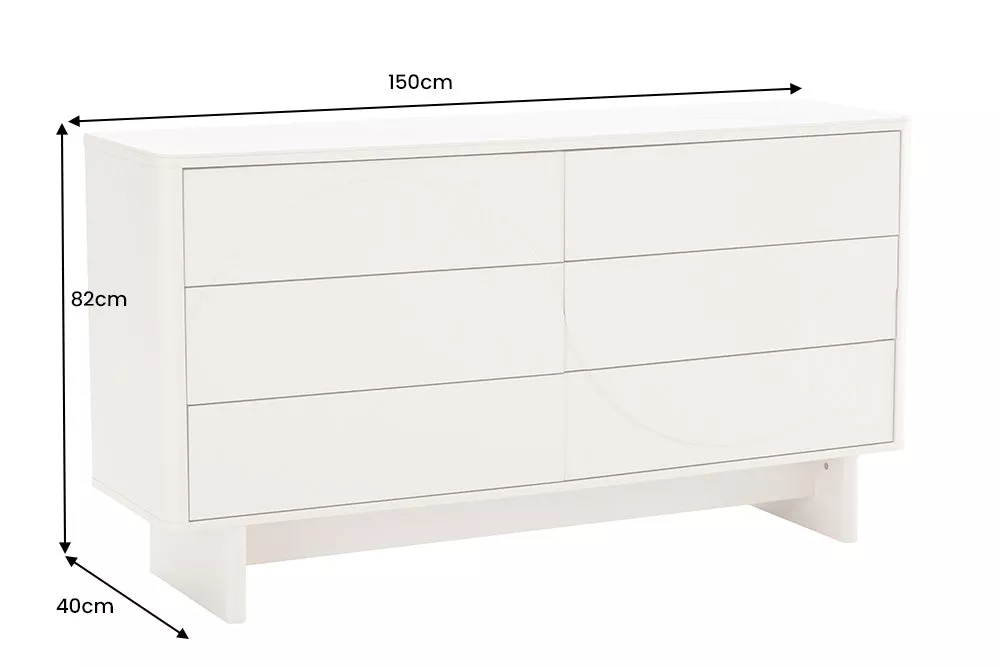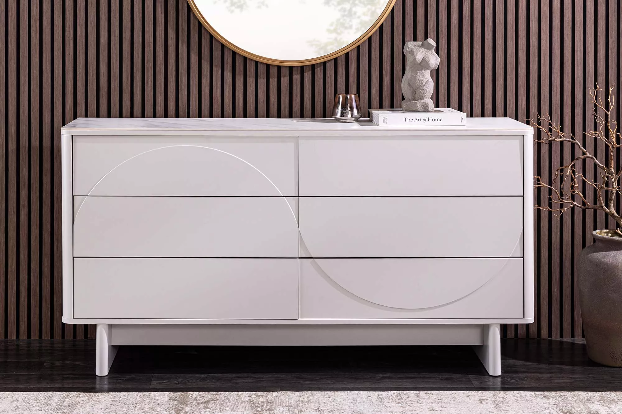 Designová komoda SAVOY 150 cm v bílé barvě s keramickou deskou v mramorovém vzhledu zaujme čistými liniemi a moderním provedením. Šest prostorných zásuvek s bezúchytovým otevíráním poskytuje dostatek úložného prostoru a zároveň podtrhuje minimalistický charakter nábytku. Díky nadčasovému designu se komoda skvěle hodí do obývacího pokoje, ložnice i jídelny a stane se elegantním doplňkem moderního interiéru.