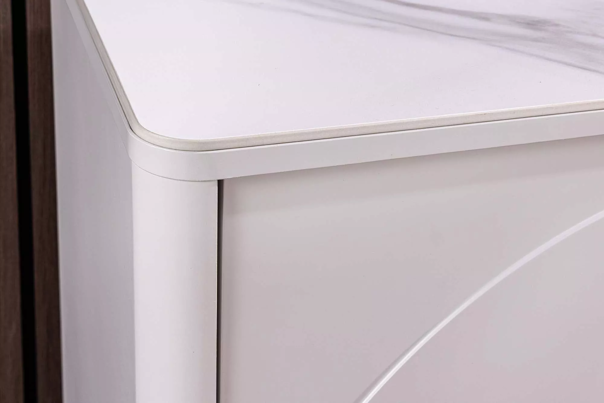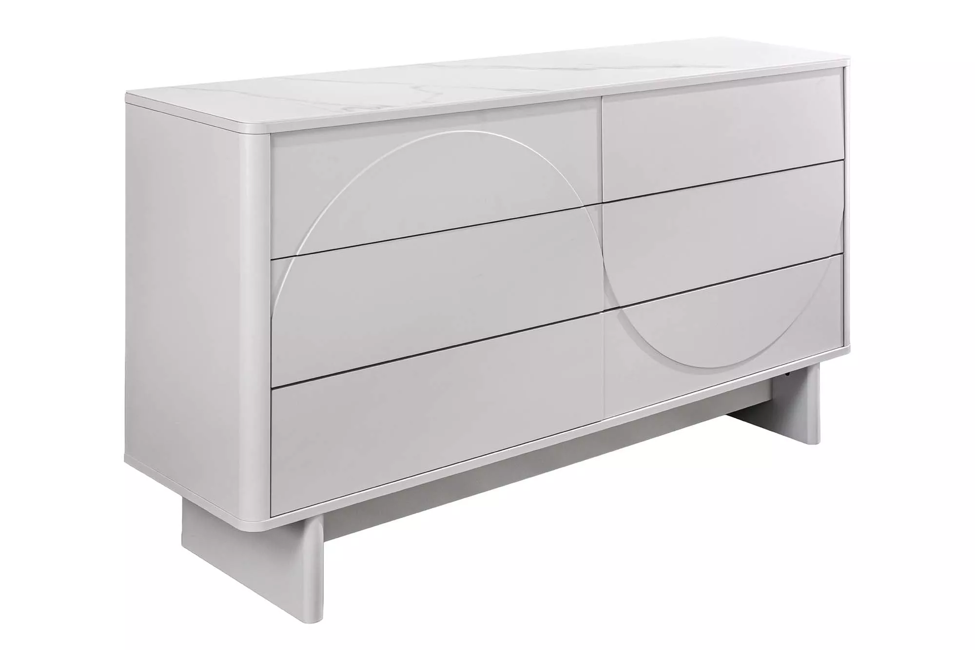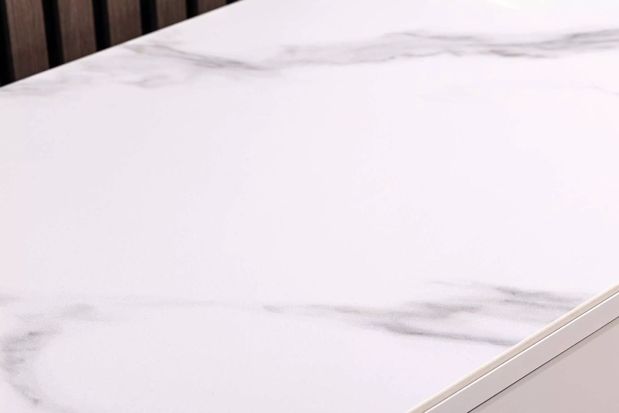 Designová komoda SAVOY 150 cm v bílé barvě s keramickou deskou v mramorovém vzhledu zaujme čistými liniemi a moderním provedením. Šest prostorných zásuvek s bezúchytovým otevíráním poskytuje dostatek úložného prostoru a zároveň podtrhuje minimalistický charakter nábytku. Díky nadčasovému designu se komoda skvěle hodí do obývacího pokoje, ložnice i jídelny a stane se elegantním doplňkem moderního interiéru.
