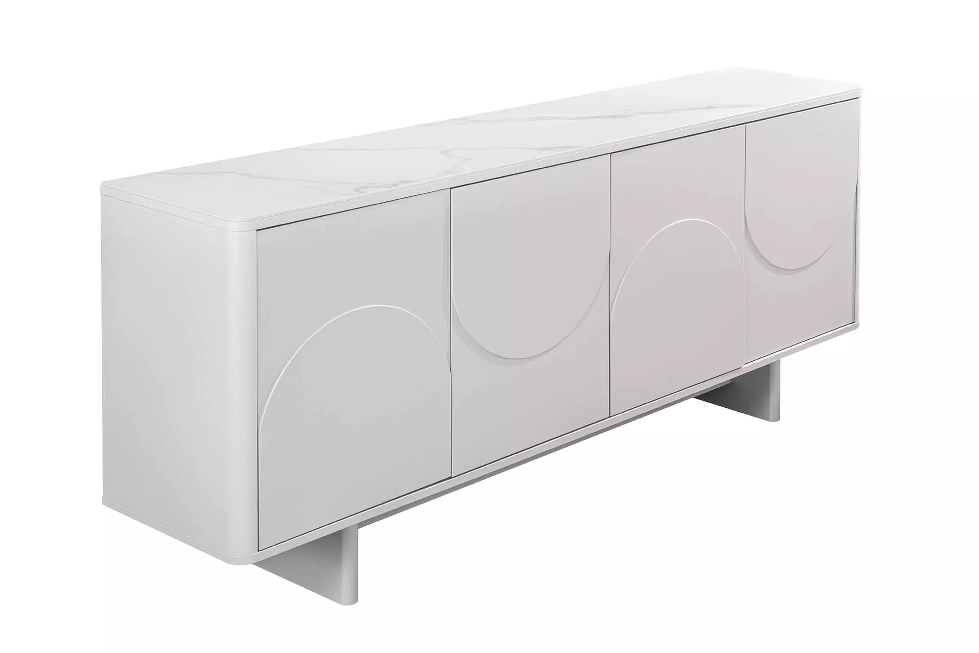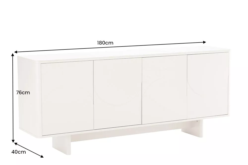 Designová komoda SAVOY 180 cm v čisté bílé s luxusní keramickou deskou v mramorovém vzhledu zaujme elegantní 3D přední stranou a bezúchytovým push-to-open systémem, který umožňuje pohodlné a tiché otevírání. Za stylovými dveřmi se skrývá prostorný úložný prostor pro sklenice, dekorace i praktické věci, což činí tuto komodu ideální volbou pro obývací pokoj, jídelnu, ložnici nebo předsíň. Díky nadčasovému designu a kvalitnímu provedení doplní každý moderní interiér o sofistikovaný a funkční prvek.