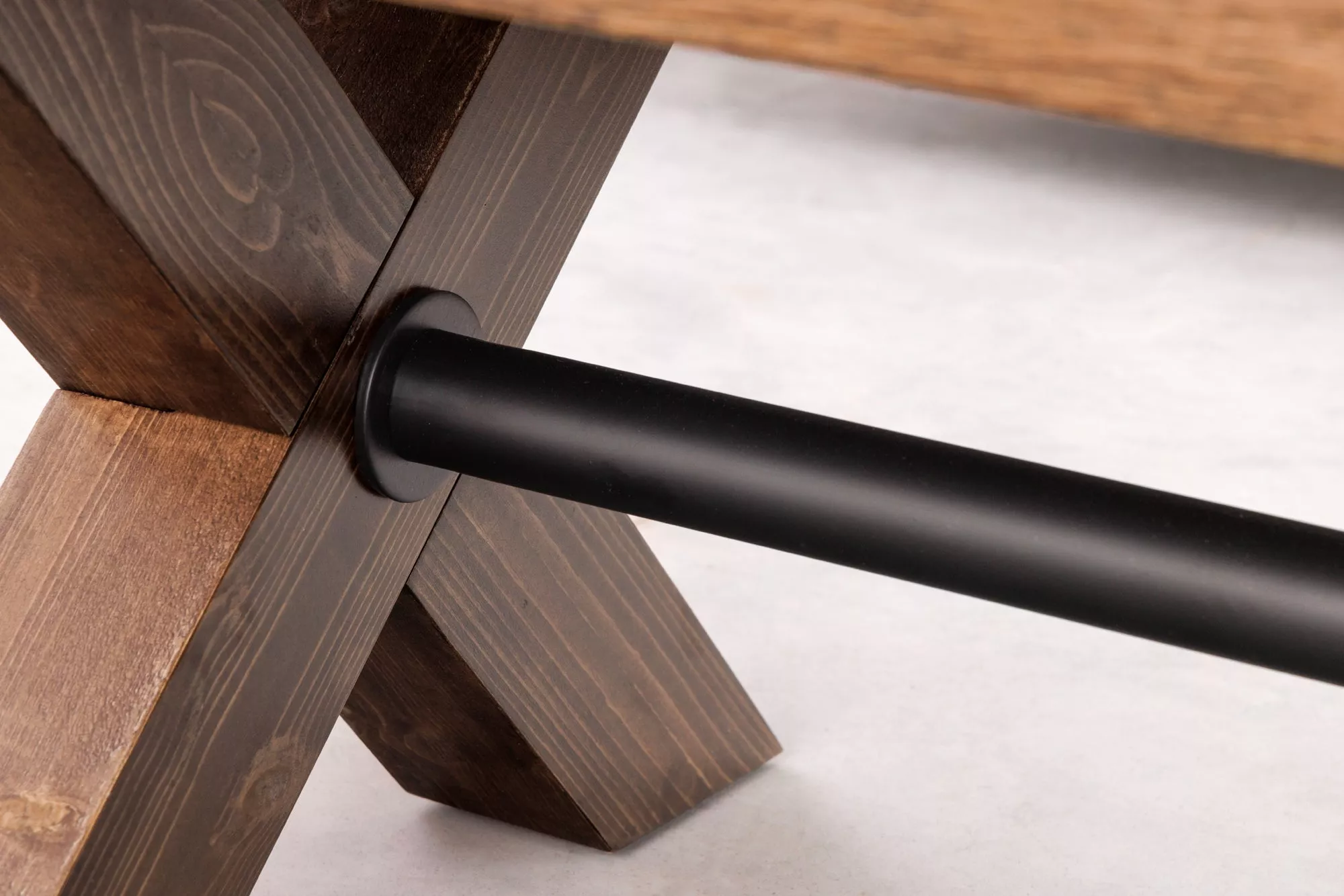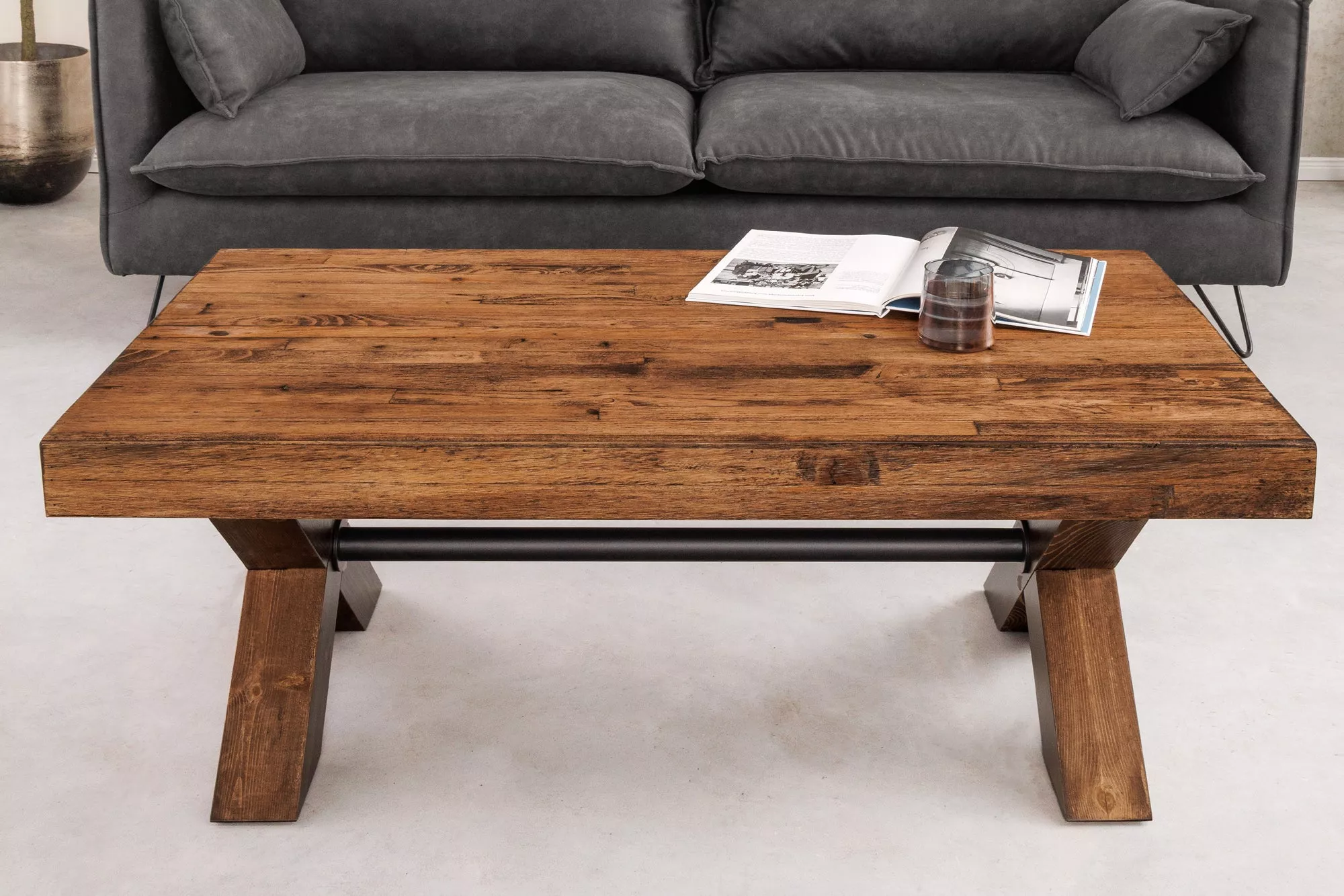 Stylový konferenční stolek z masivního dřeva s robustním kovovým rámem v industriálním designu. Deska v přírodním odstínu krásně zvýrazní dřevěnou strukturu, podnož ve tvaru X dodává stabilitu i výrazný vzhled. Skvěle doplní moderní i rustikální interiéry, nabízí praktickou plochu pro dekorace, knihy nebo nápoje.