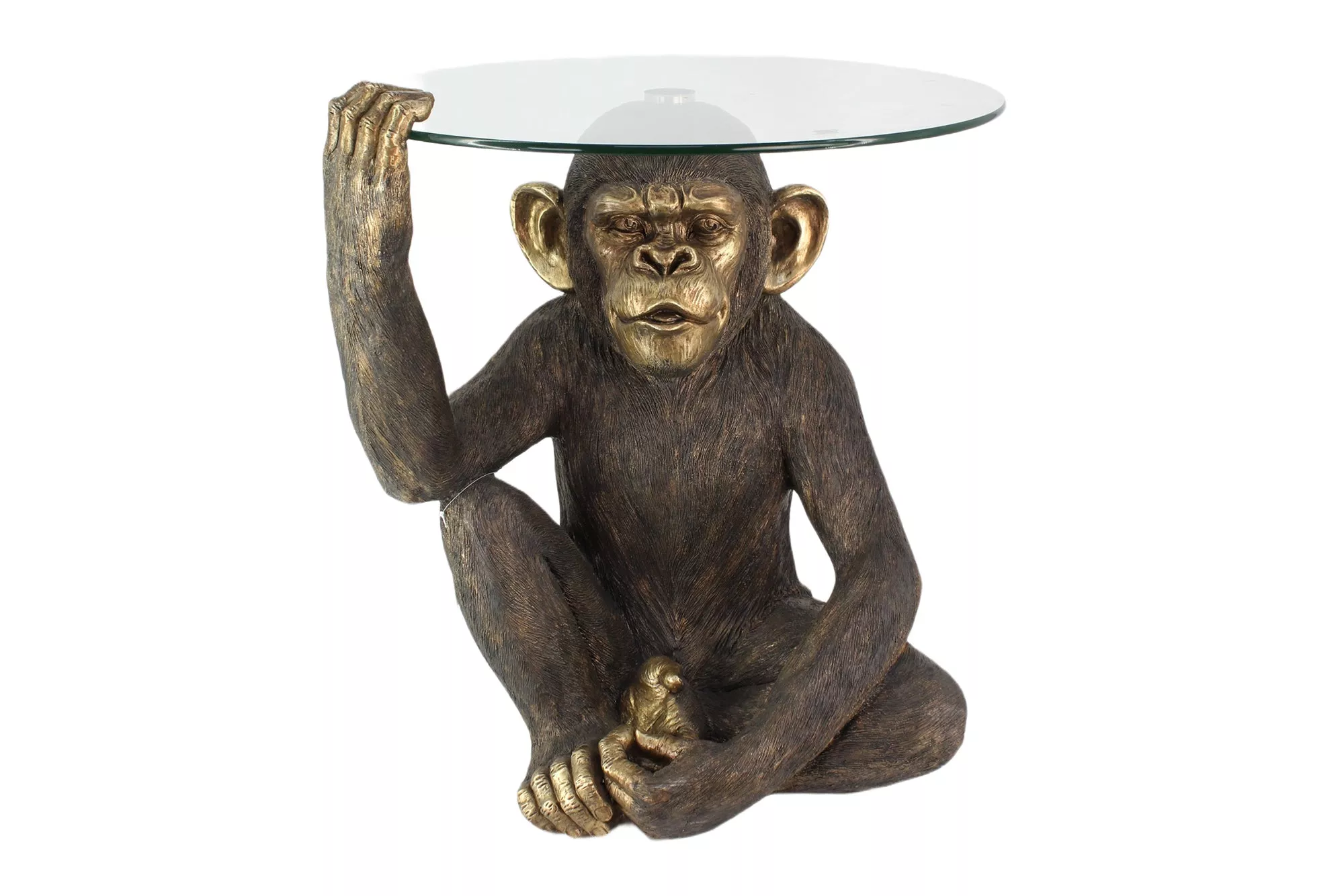 Kulturně stylový konferenční stolek KING APE 65 cm s kulatou deskou z čirého bezpečnostního skla a černozlatým podstavcem s detailní figurou opice je ručně vyráběný designový kousek, který se stane středobodem vašeho obývacího prostoru. Robustní, ale zároveň elegantní konstrukce spojuje funkční odkládací prostor s uměleckým prvkem a dodává moderním, glam nebo urban interiérům osobitý charakter a kreativní atmosféru.