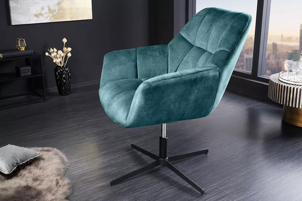Stylové sametové křeslo PAPILLON v petrolejové barvě s černým kovovým podstavcem. Díky měkkému polstrování a ergonomické sedací části nabízí pohodlné posezení — navíc je výškově nastavitelné a otočné o 360°, takže se perfektně hodí do obýváku, pracovny i relaxační zóny. Kombinace elegantního sametu a stabilní konstrukce dává křeslu nadčasový vzhled a maximální komfort.