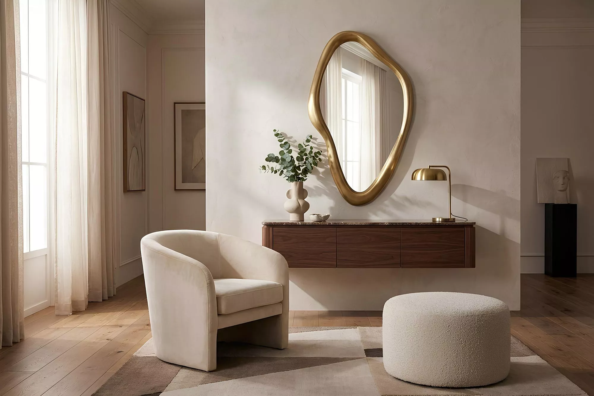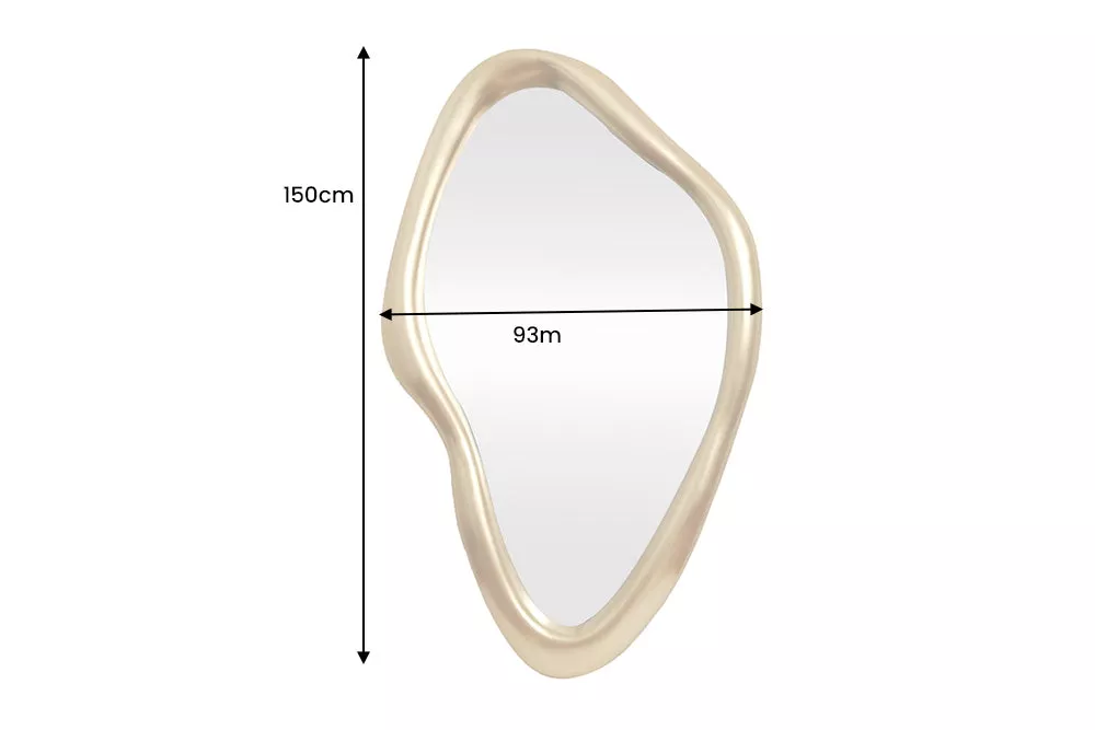 Moderní zlaté nástěnné zrcadlo MARQUISE 150 cm je výrazným designovým prvkem, který kombinuje funkčnost s elegantní organickou formou. Plynule tvarovaný rám v luxusním zlatém odstínu dodává interiéru moderní a nadčasový charakter a okamžitě přitahuje pozornost. Díky variabilnímu zavěšení lze zrcadlo umístit vertikálně i horizontálně, což umožňuje snadné přizpůsobení obývacímu pokoji, předsíni i ložnici. Velká zrcadlová plocha opticky zvětšuje prostor, zvyšuje světelnost místnosti a vytváří harmonický vizuální efekt. Designové zrcadlo MARQUISE je ideální volbou pro moderní interiéry, které kladou důraz na styl, originalitu a kvalitní zpracování.