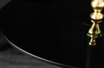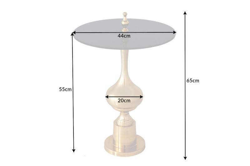 Rozměry jsou 44 cm na šířku, 66 cm na výšku a 44 cm do hloubky, se skleněnou deskou z bezpečnostního skla. Stojná noha je ve zlaté barvě, která přináší do prostoru svěžest a luxusní vzhled. Deska je černá, což dodává nábytku moderní a sofistikovaný vzhled. Materiálové složení podstavce je kovovo-hliníková slitina, díky tomu je stolek lehký a pevný zároveň. Deska stolu je vyrobena z bezpečnostního tvrzeného skla, které je velmi pevné a odolné proti úderům a nárazům. Značným násilím se dá ale rozbít vše, pokud tedy dojde k rozbití, tak o toto sklo se nelze pořezat, protože nevznikají ostré střepy, ale takzvané neostré plošky, o které se nelze poranit. Bezpečnostní tvrzené sklo, ze kterého je vyráběn nábytek, je tedy stejně bezpečné jako nábytek dřevěný.