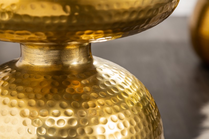 Odkládací stolek ORIENT ve zlaté barvě představuje elegantní a stylový prvek, který zaujme na první pohled. Stolek je jedinečný nejen svou výraznou barvou, ale především bohatým tepaným povrchem, který vytváří plastický a vizuálně přitažlivý efekt. Tento dekorační prvek dodává stolku exotický vzhled a přináší do interiéru prvky orientálního stylu.