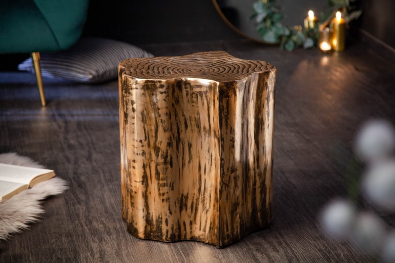 Odkládací stolek ORIENT NATUR ve zlaté barvě představuje elegantní a stylový prvek, který zaujme na první pohled. Stolek je jedinečný nejen svou výraznou barvou, ale především dekorativní rytinou na horní ploše stolku, která je designovaná jako letokruhy. Boční strany stolku jsou poté doladěny barvou, aby co nejvíce imitovali kmen stromu. Tento dekorační prvek dodává stolku přírodní i exotický vzhled.