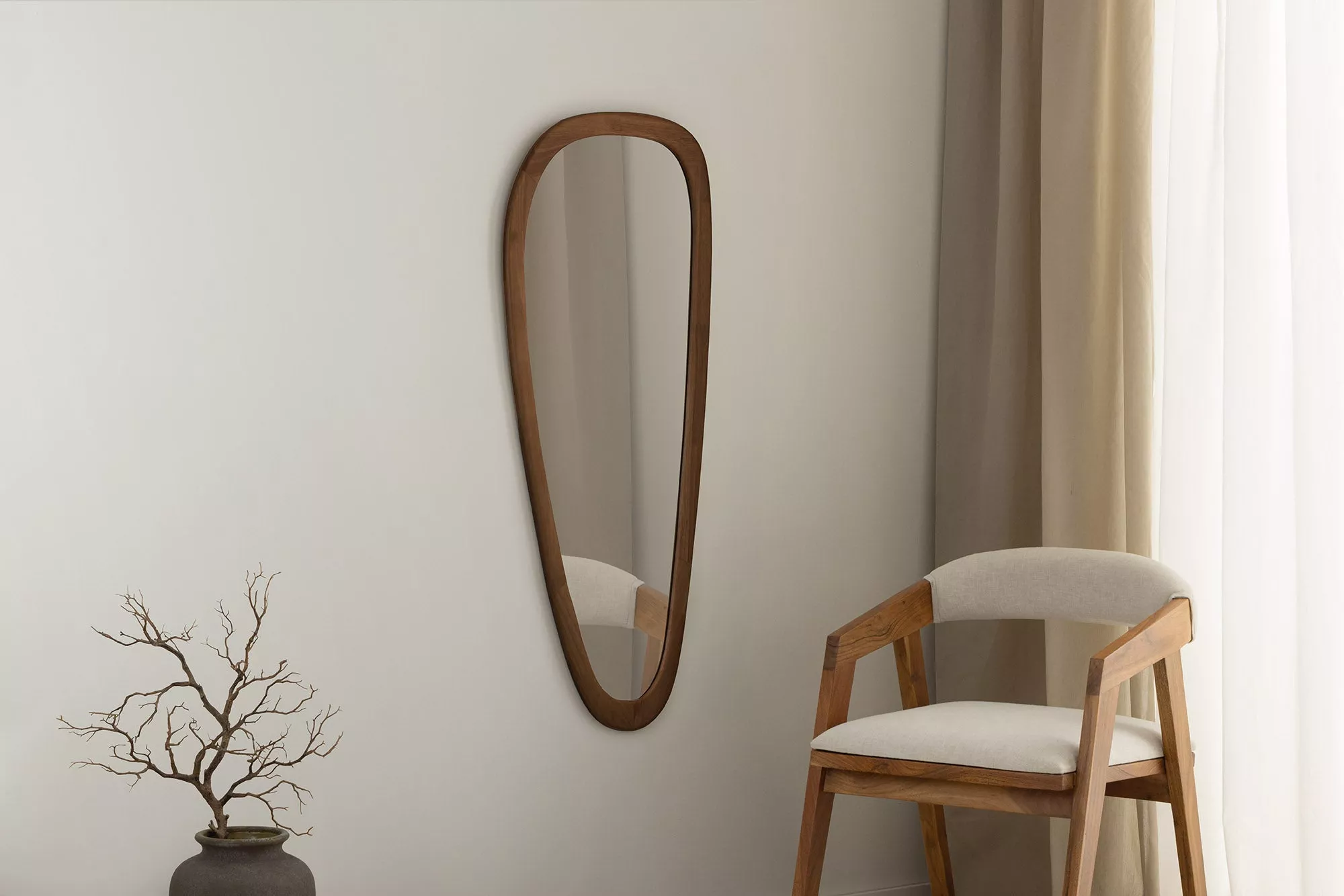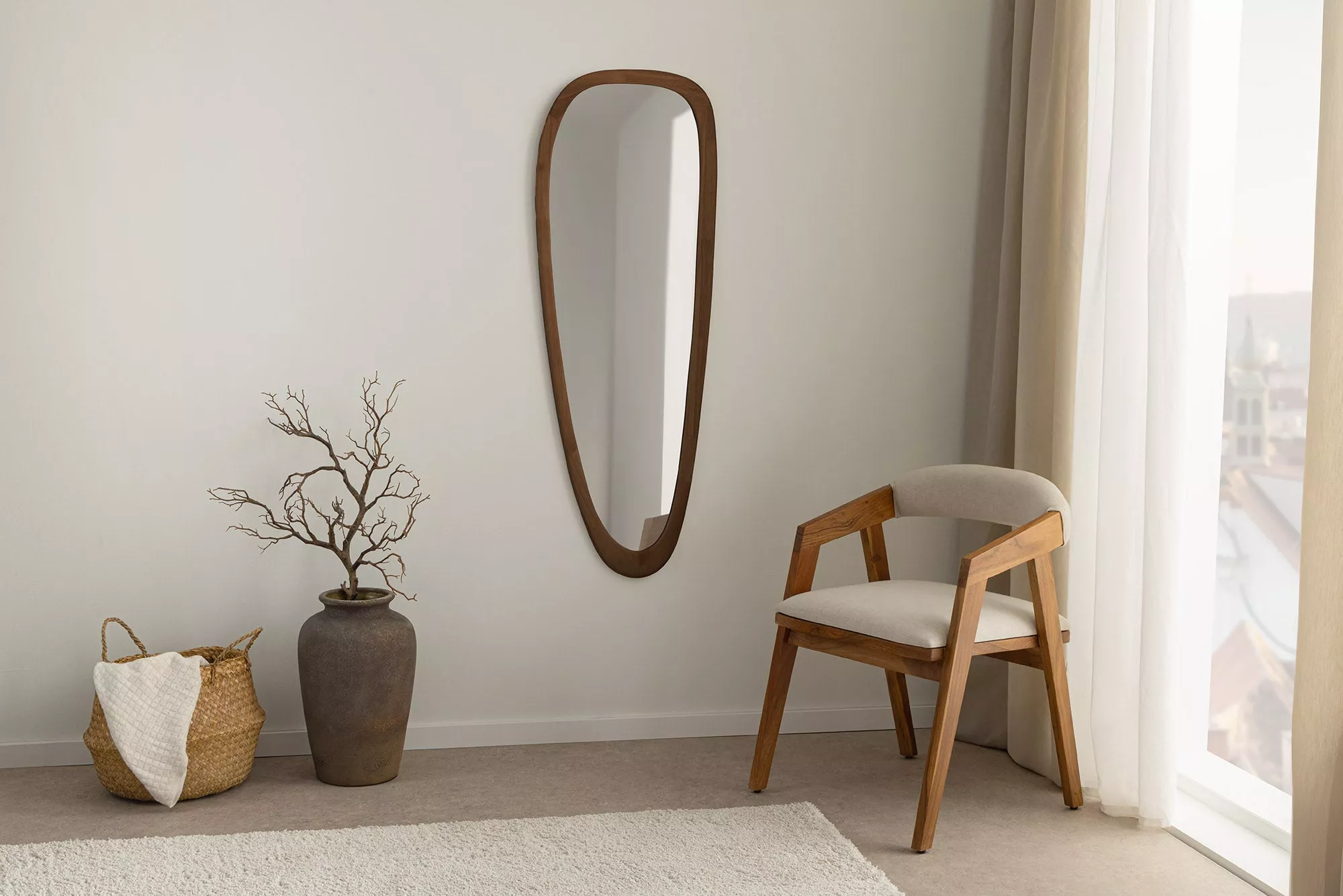 Masivní nástěnné zrcadlo ORGANIC 120 cm v ořechovém designu zaujme svým organickým rámem s jemně zakřivenými liniemi a přirozenou strukturou dřeva, která vnese do vašeho interiéru harmonii a přírodní eleganci. Díky velké zrcadlové ploše opticky zvětšuje místnost a doplňuje jak moderní, tak skandinávský nebo rustikální styl bydlení. Závěsné provedení na stěnu podtrhuje čistý, estetický vzhled a zaručuje, že tento kousek bude praktickým i dekorativním prvkem vašeho domova.