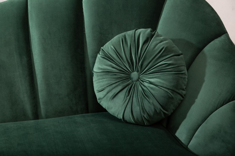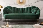 Pohovka ARIELLE ve výrazné tmavě zelené barvě ze sametu představuje skutečný vrchol luxusu a elegance, ideální pro náročné zákazníky s vytříbeným vkusem. Její netradiční design zaujme na první pohled a díky svému výjměčnému vzhledu, který připomíná mořskou mušli, se snadno stane ústředním prvkem každého interiéru. Jemné ozdobné prošívání na opěradle dodává pohovce šmrnc, zatímco měkké polstrování zajišťuje nekompromisní pohodlí. K tomu přispívá i designový polštářek na každé straně. Rám pohovky je vyroben z masivního tvrdého dřeva, což jí dodává vynikající stabilitu a dlouhou životnost. Ocelové nohy ve zlaté barvě zajišťují pevnost. Kombinace zelené barvy a zlatých akcentů působí velmi luxusně a elegantně.