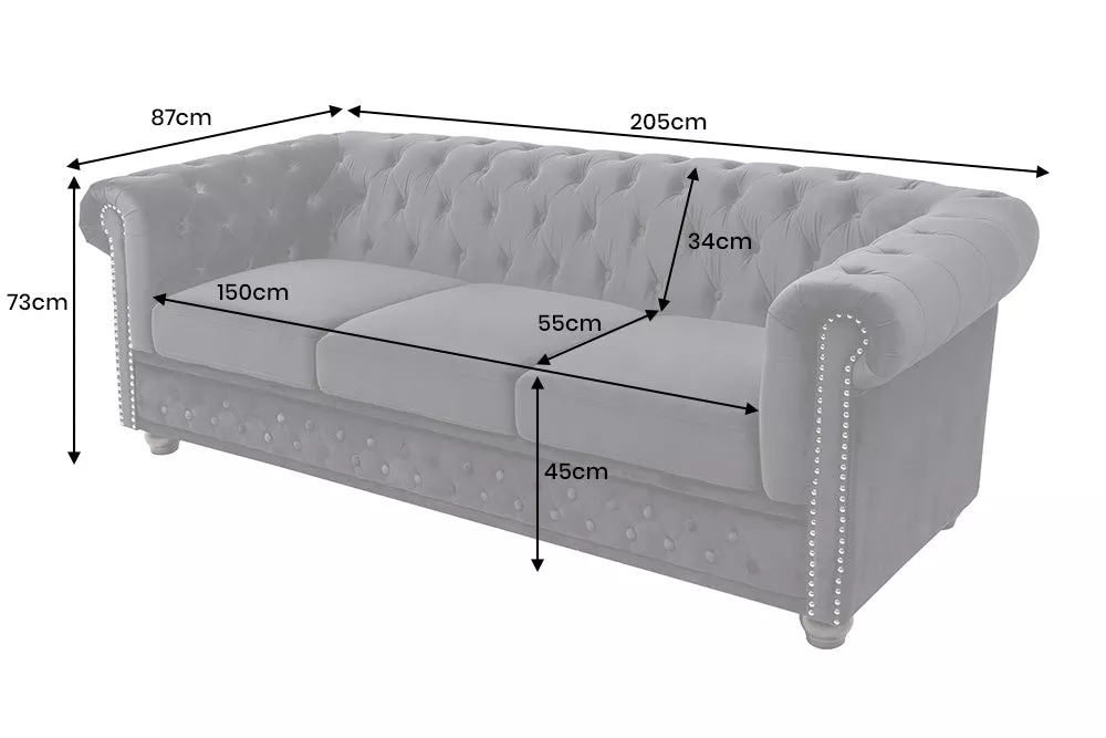 Tato černá sametová pohovka ve stylu Chesterfield promění každý obývací pokoj v elegantní, reprezentativní prostor. Její ikonické nýtování, bohatě tvarované područky a hluboký, měkký samet okamžitě přitáhnou pozornost. Srdcem konstrukce je kvalitní polstrování, který zajišťuje stabilní a dlouhodobě pohodlné sezení — ideální jak pro každodenní relax, tak pro večery s přáteli. Šířka 205 cm poskytne dostatek místa pro tři osoby a pevné dřevěné nohy v tmavě hnědé barvě dodávají sedačce jistotu i nadčasový charakter. Tento třísedák je perfektní volbou pro zákazníky, kteří chtějí spojit noblesní design s praktickým komfortem. Vynikne v moderním prostoru, industriálním interiéru i v klasickém bytě, kde se stane jedním z hlavních prvků celé místnosti.