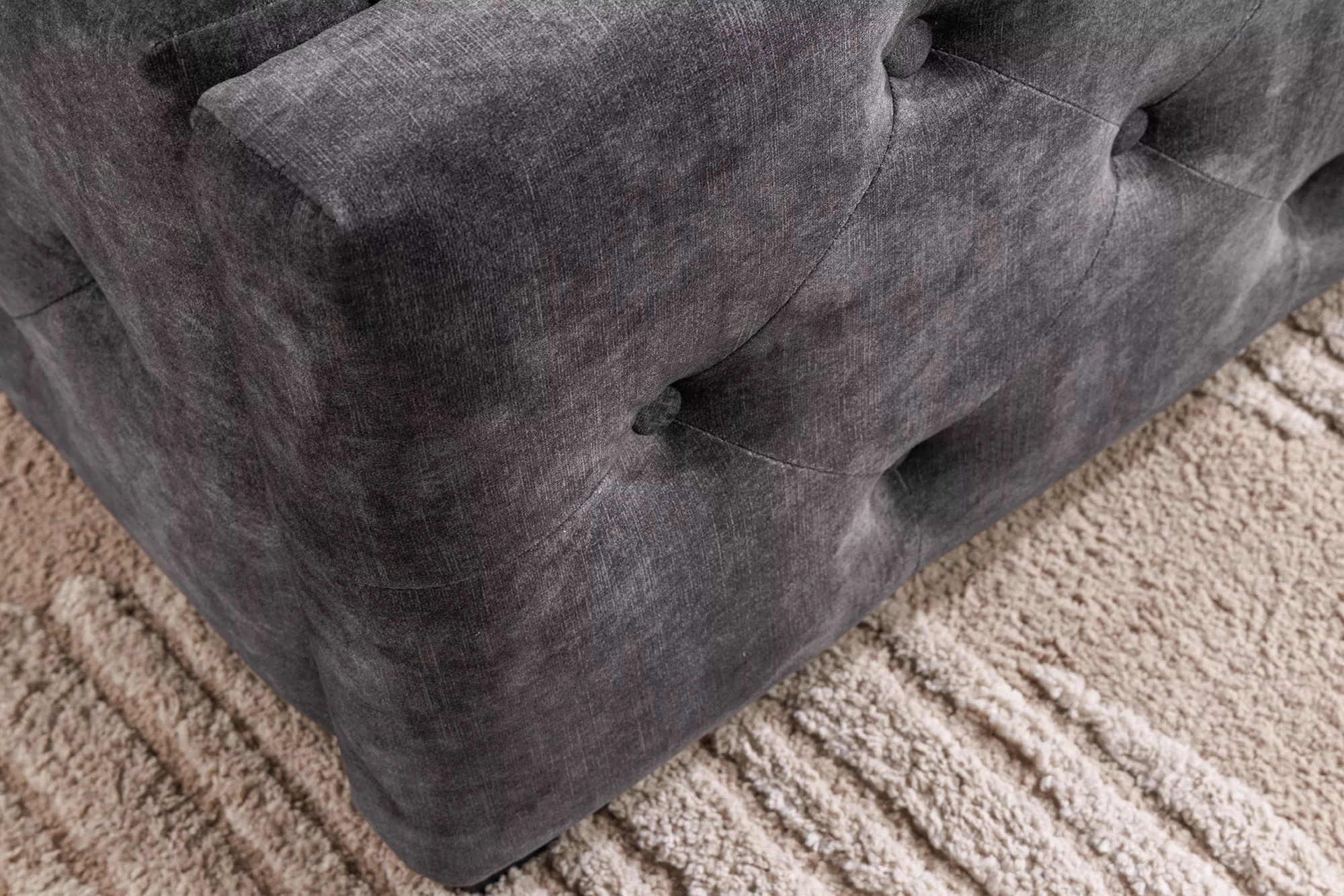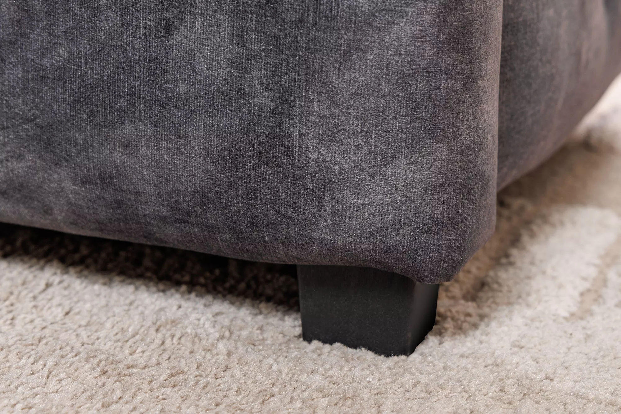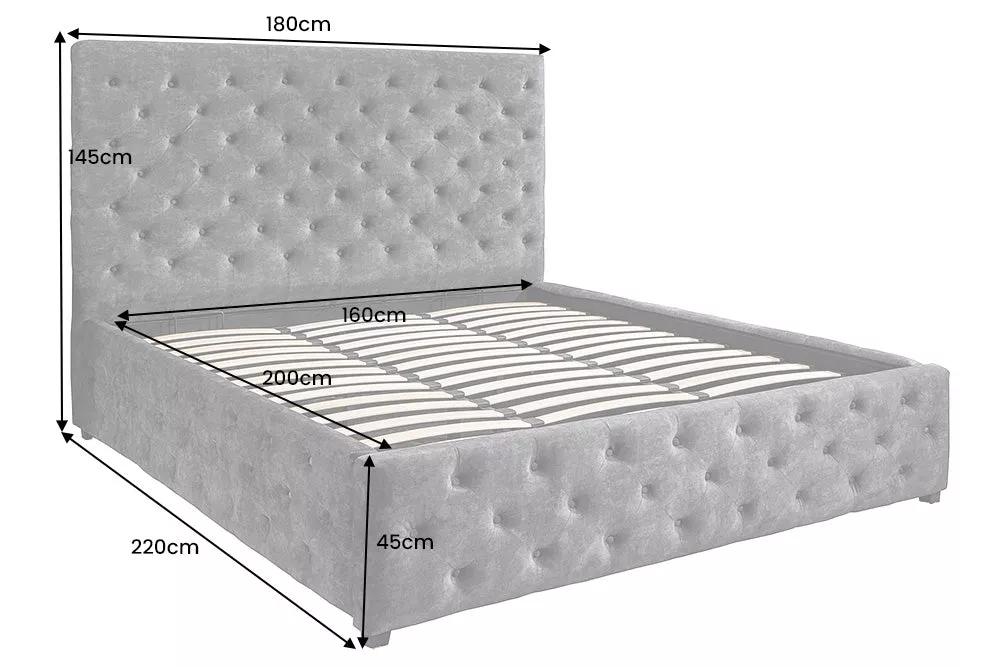 Moderní postel PARIS přináší do vaší ložnice elegantní design i skryté funkce. Je čalouněná měkkým šedým sametem, zdobená knoflíkovým Chesterfield prošíváním, a nabízí prostorný úložný prostor pod lůžkem. Konstrukce z masivního dřeva s nosností až cca 240 kg zaručuje pevnost, filcové kluzáky chrání podlahu a výsuvný mechanismus usnadňuje přístup k úložnému prostoru. Matrace není součástí – postel se dodává jako rám s úložným boxem.