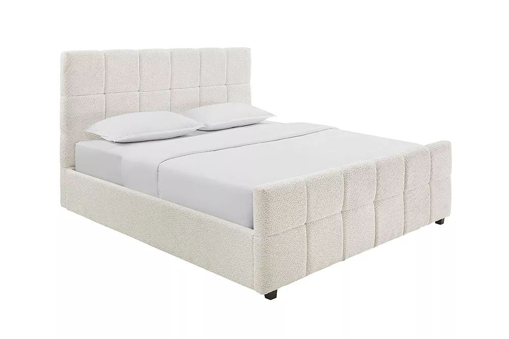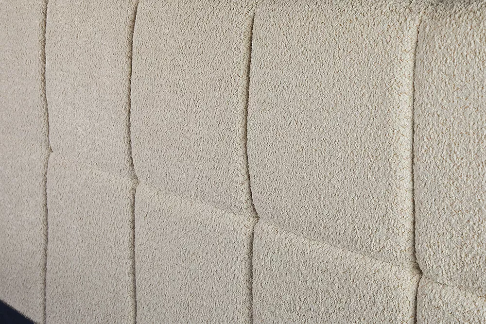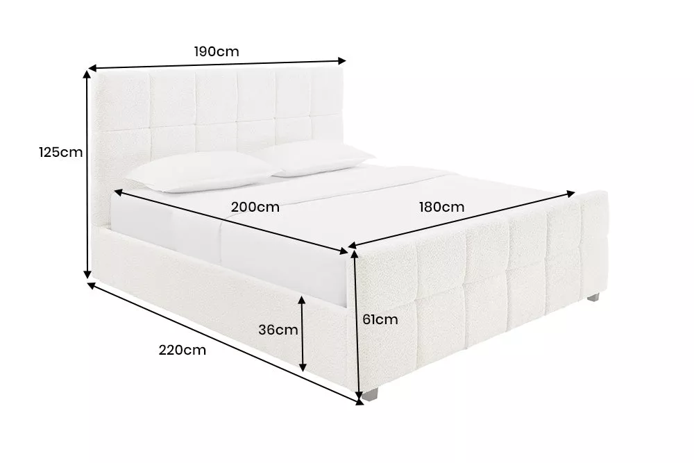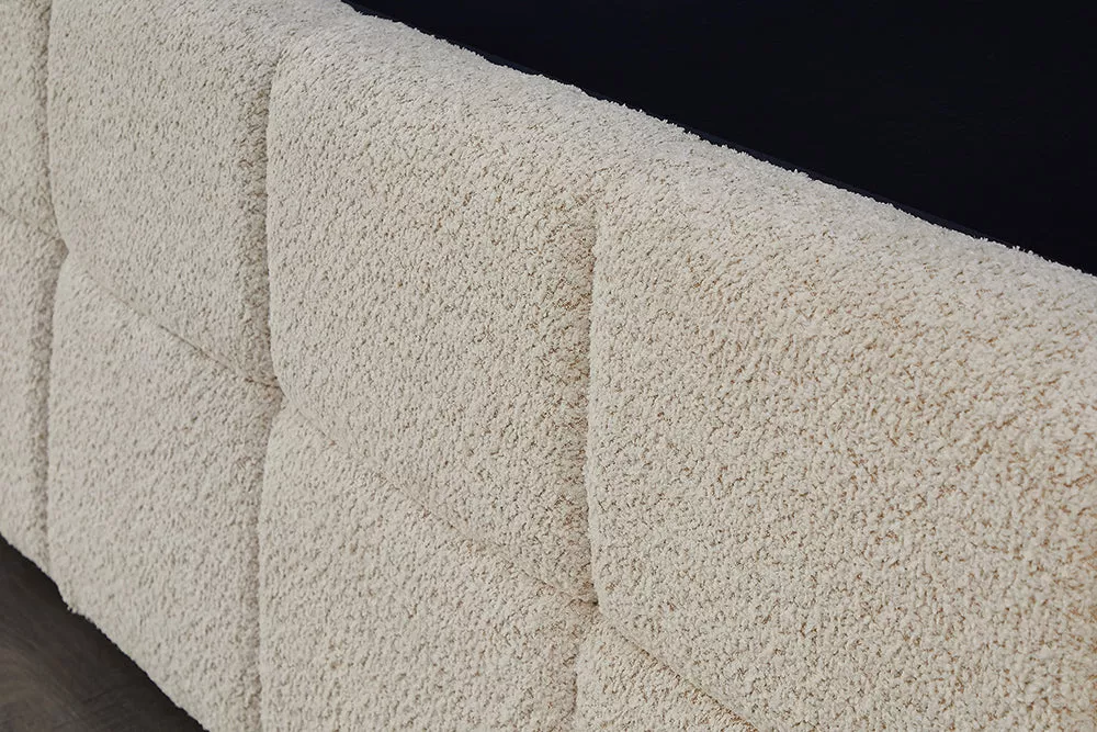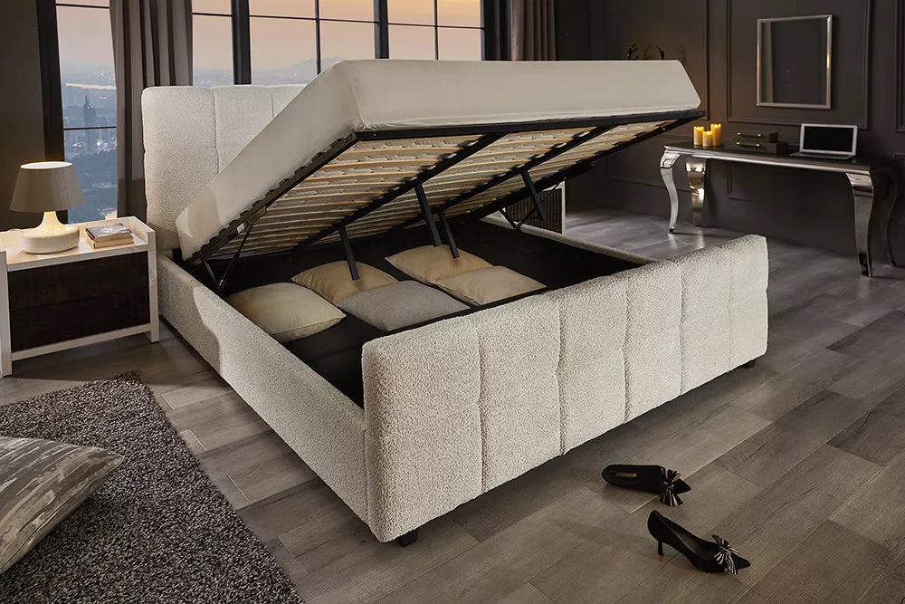 Moderní postel v krémové barvě z luxusní bouclé látky s integrovaným úložným prostorem pod lůžkem. Elegantní design, pohodlné čelo a pevná konstrukce dělají z této postele stylový i praktický prvek každé ložnice. Ideální volba pro ty, kteří hledají kombinaci vzhledu a funkčnosti.