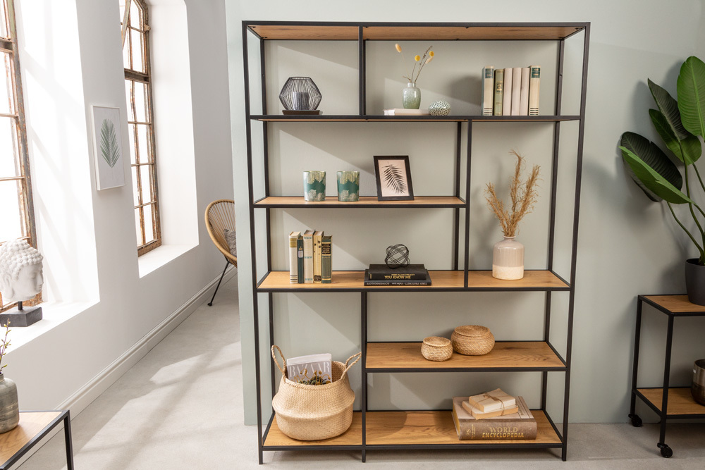 Vysoký regál SLIM LINE černé barvy rámu a s dekorem divokého dubu je luxusní a elegantní kus nábytku, které okamžitě upoutají pozornost v jakékoli místnosti. Regál je jedinečný nejen svou výraznou barvou a tvarem, ale především minimalistickým a jednoduchým designem, díky čemuž se perfektně hodí do industriálních, art deco, minimalistických nebo i moderních interiérů, a to nejen do obývacího pokoje, kuchyně, ale také do pracovny či vstupní haly. Díky svým širokým policím je ideální pro vystavení dekorací, knih, drobností, koření nebo květin, čímž vytvoří útulnou a stylovou atmosféru v místnosti.