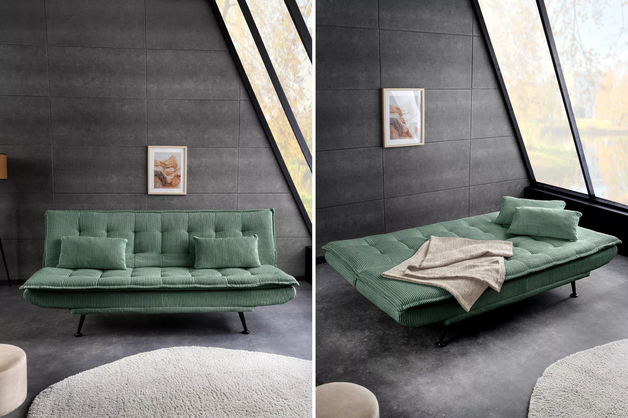 Moderní rozkládací pohovka JAZZ v zeleném manšestrovém provedení přináší styl i funkčnost. Tato 3místná sedačka nabízí pohodlný sedací komfort a snadno se přemění na lůžko o rozměru 190 cm x 110 cm. Robustní konstrukce z masivního dřeva s kovovými nohami zaručuje stabilitu, zatímco měkký manšestrový potah dodává hřejivý nádech interiéru. Dva dekorativní polštáře již v balení přispívají k útulnosti. Díky jednoduchému mechanismu se pohovka snadno přizpůsobí vašim potřebám — ať už chcete relaxovat, přijmout hosty nebo využít prostor navíc.
