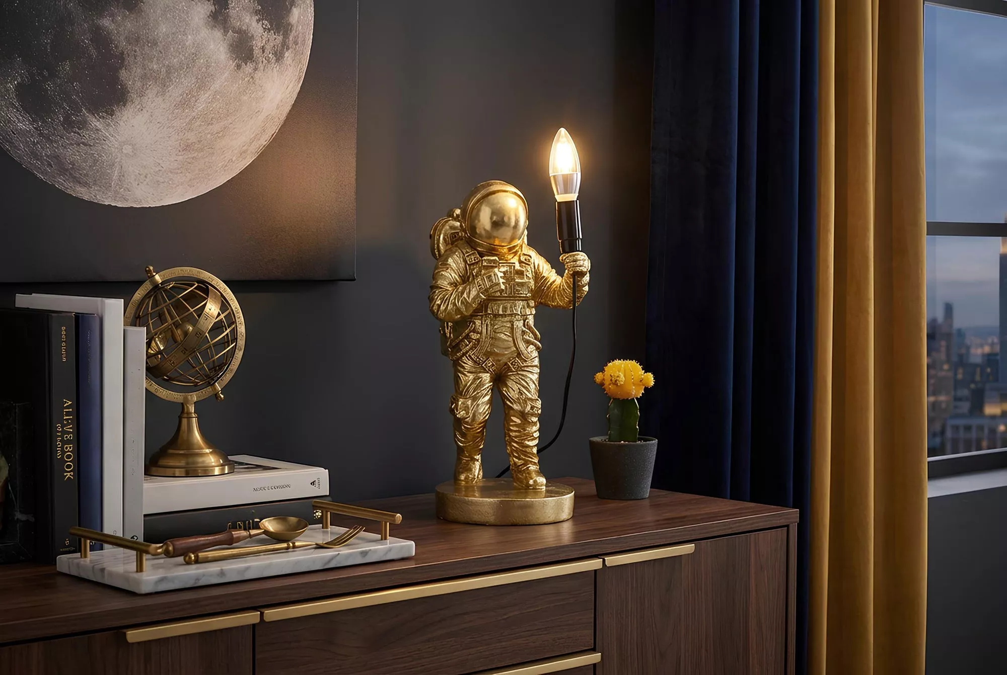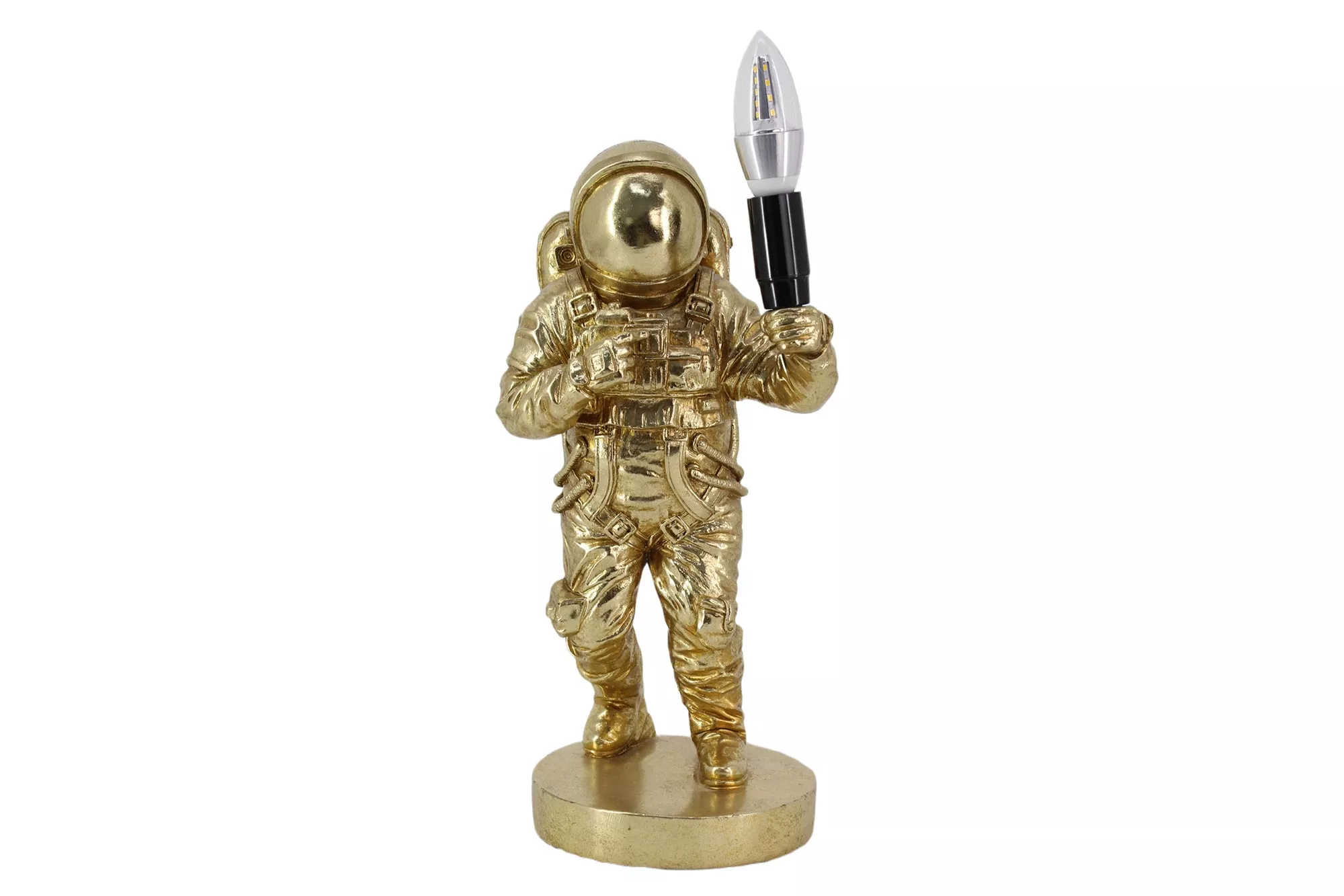 Dekorativní stolní lampa ASTRONAUT 37 cm ve zlatém provedení je ručně vyráběná designová skulptura astronauta z polyresinu, která drží světelnou „pochodeň“ a vytváří tak působivý vizuální efekt bez potřeby žárovky. Tento unikátní kousek kombinuje uměleckou estetiku s funkcí osvětlení a přináší futuristický a zároveň elegantní akcent do moderních interiérů – ideální jako stylový doplněk na konzolový stolek, komodu nebo noční stolek, kde zvýrazní váš osobitý styl bydlení.
