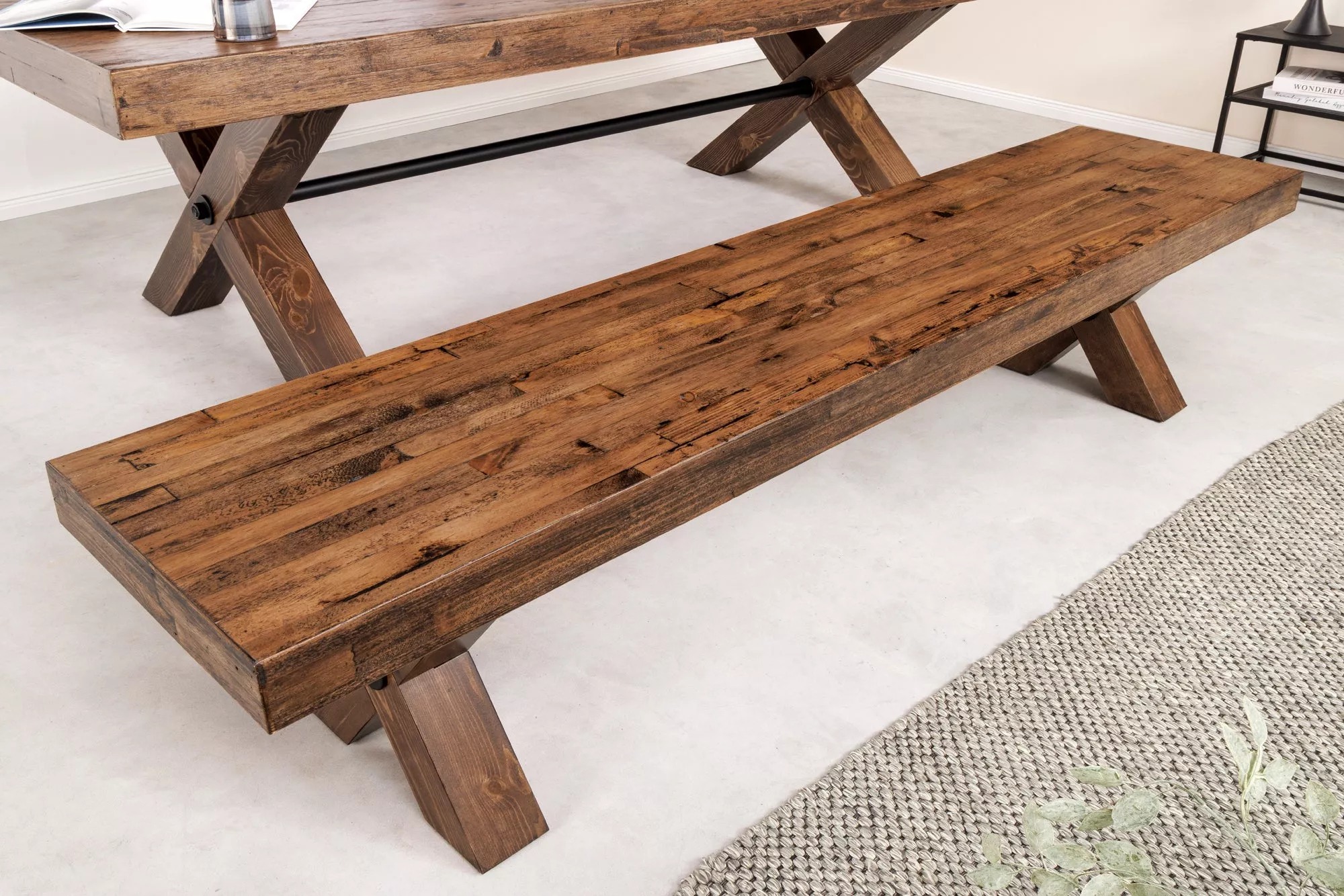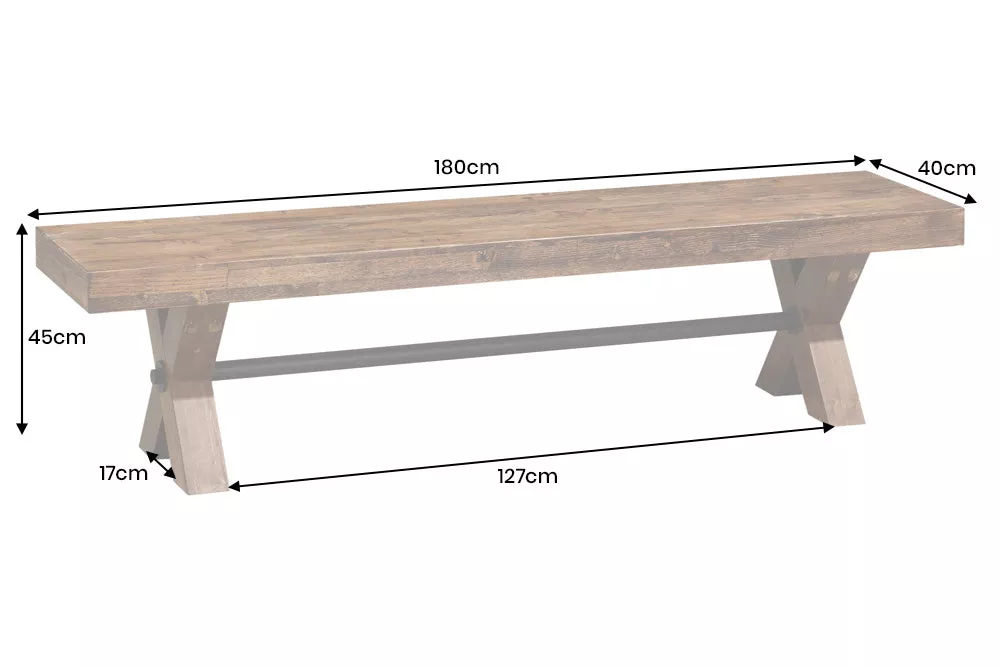 Lavice GOLIATH 180 cm spojuje přírodní sedací desku z masivní borovice s robustním rámem ve tvaru X a středovou černou výztuží pro maximální stabilitu. Přírodní odstín dřeva zdůrazňuje kresbu a strukturu, X rám dodává kontrastní industriální nádech. Vhodná jako lavice k jídelnímu stolu, do předsíně nebo na chodbu — elegantní, pevná a stylová volba pro moderní interiér.
